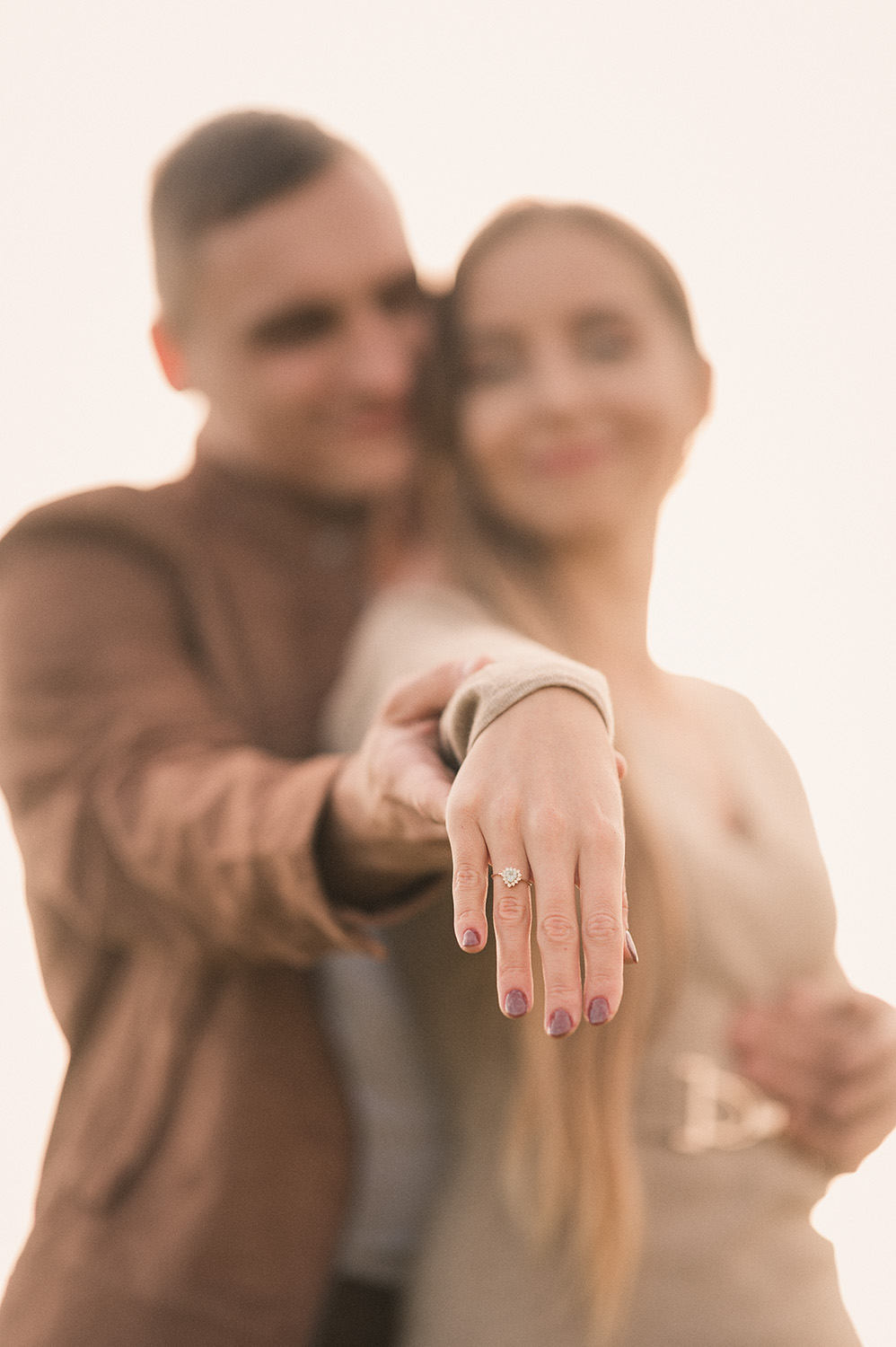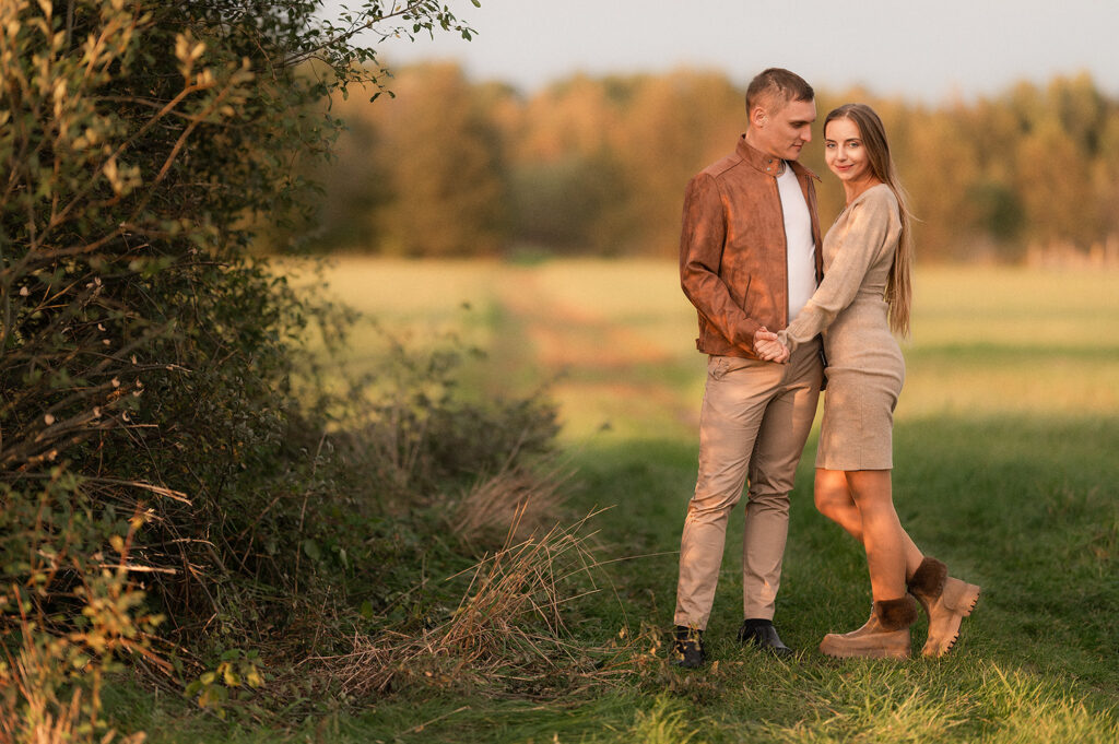 Zaczynając od delikatnych ujęć pierścionka zaręczynowego, przez romantyczne chwile w objęciach, aż po beztroskie leżenie na trawie – każde zdjęcie emanuje ciepłem i szczerością. Stylizacje pary w naturalnych, ziemistych odcieniach idealnie współgrały z jesienną aurą. To połączenie natury, światła i emocji stworzyło obrazy, które są zarówno intymne, jak i artystyczne.