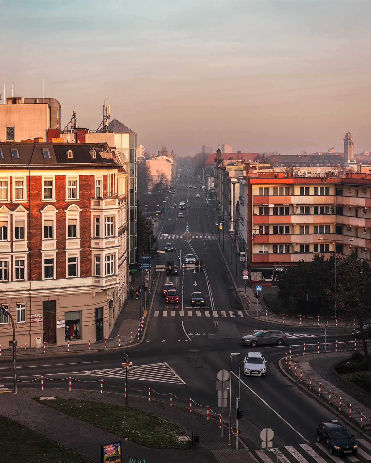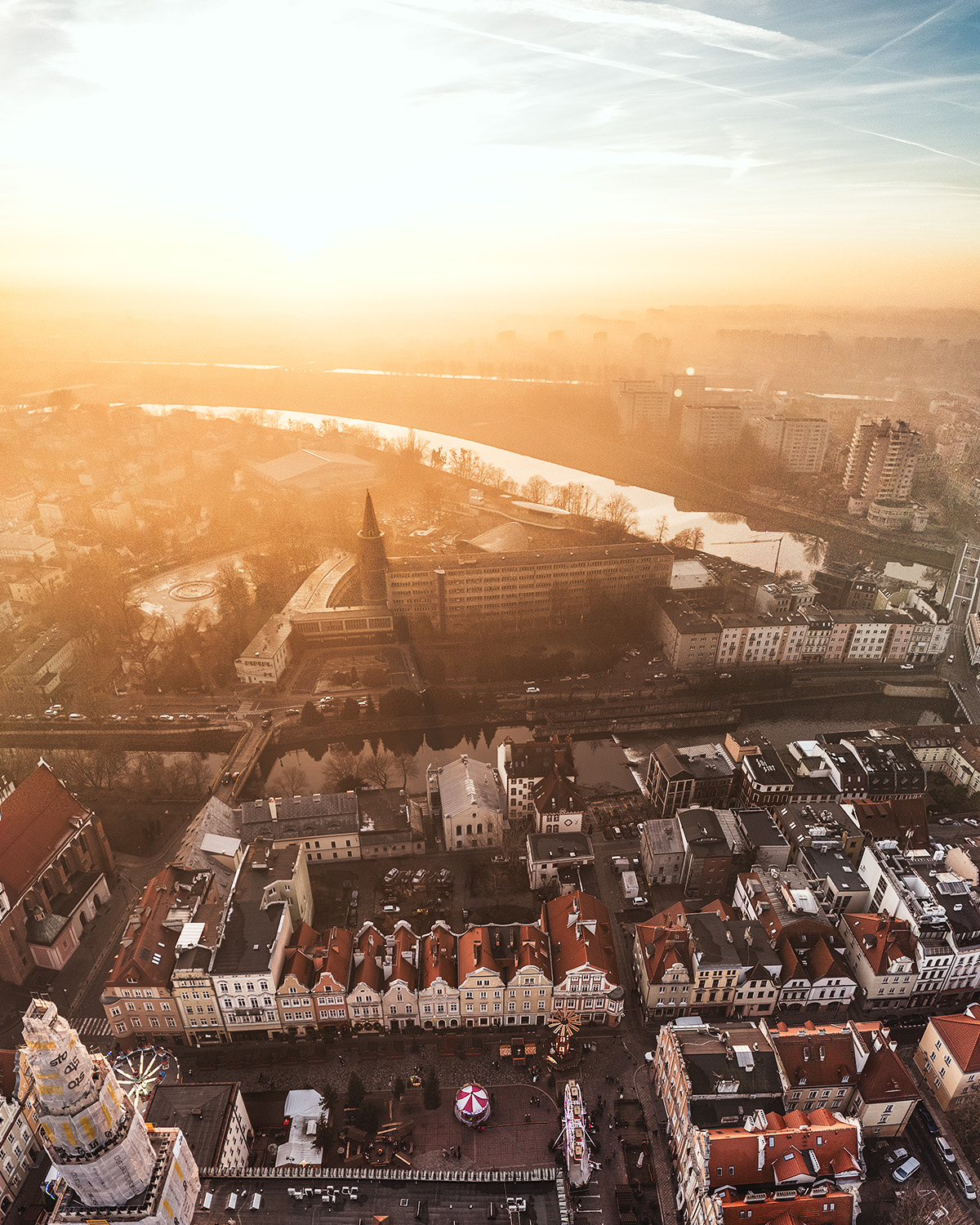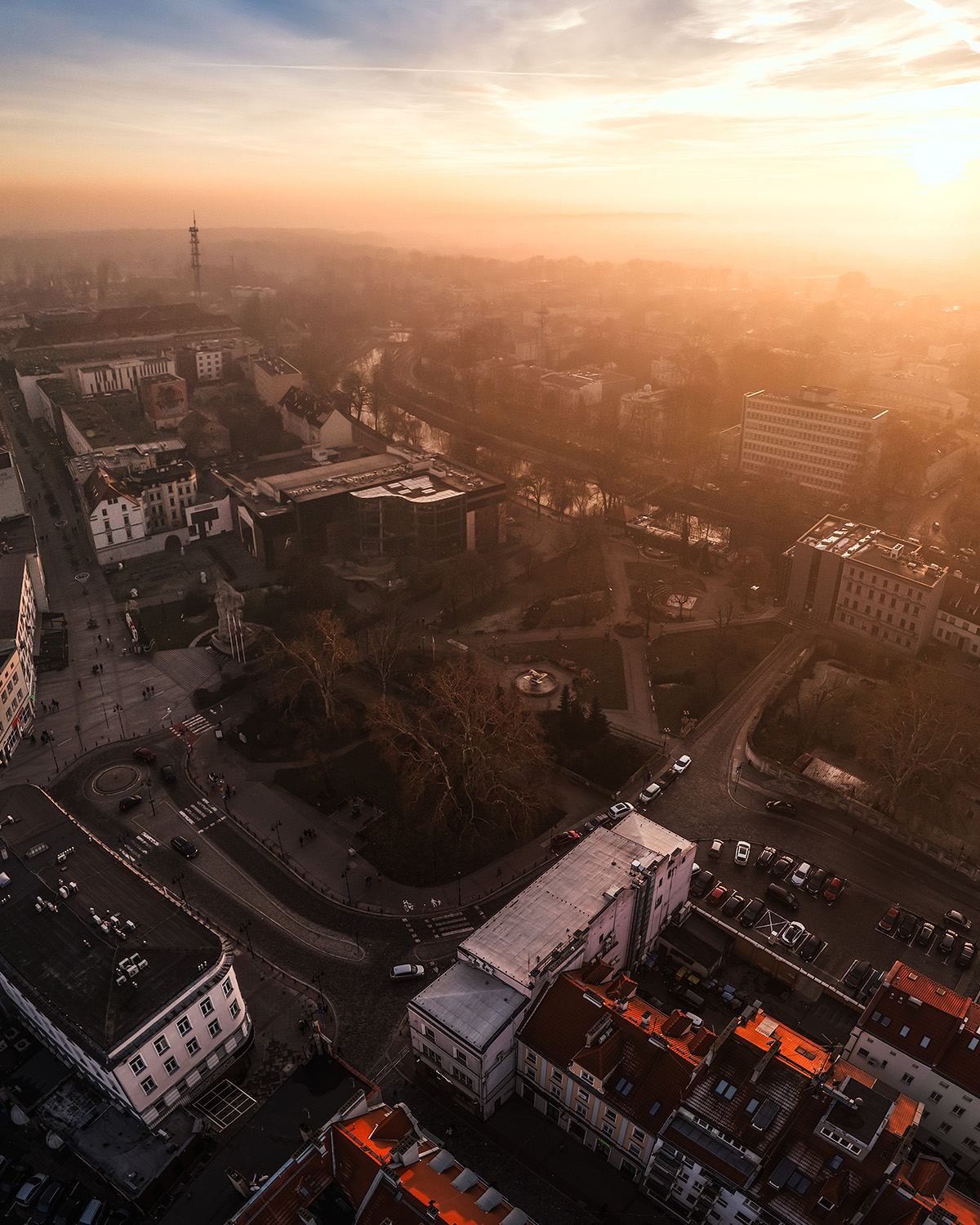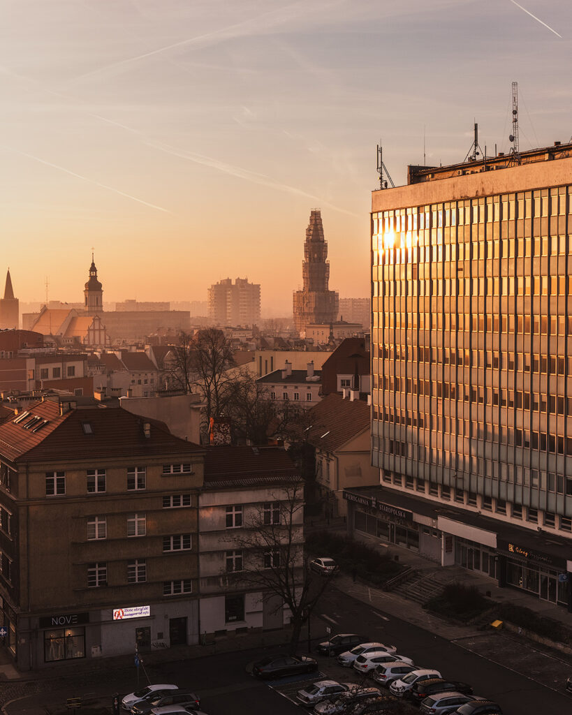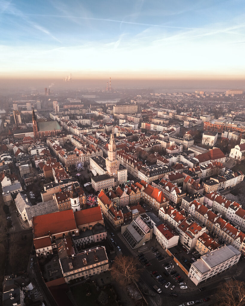 Kiedy miasto zanurza się w złocistym świetle zimowego późnego popołudnia, a chłodne powietrze otula jego ulice, świat nabiera niepowtarzalnego uroku. Opole, widziane z perspektywy drona DJI Air 3, ukazuje swoje różnorodne oblicza – od modernistycznych fasad po historyczne zabudowania. Ta sesja zdjęciowa to opowieść o harmonii architektury, światła i nastroju.