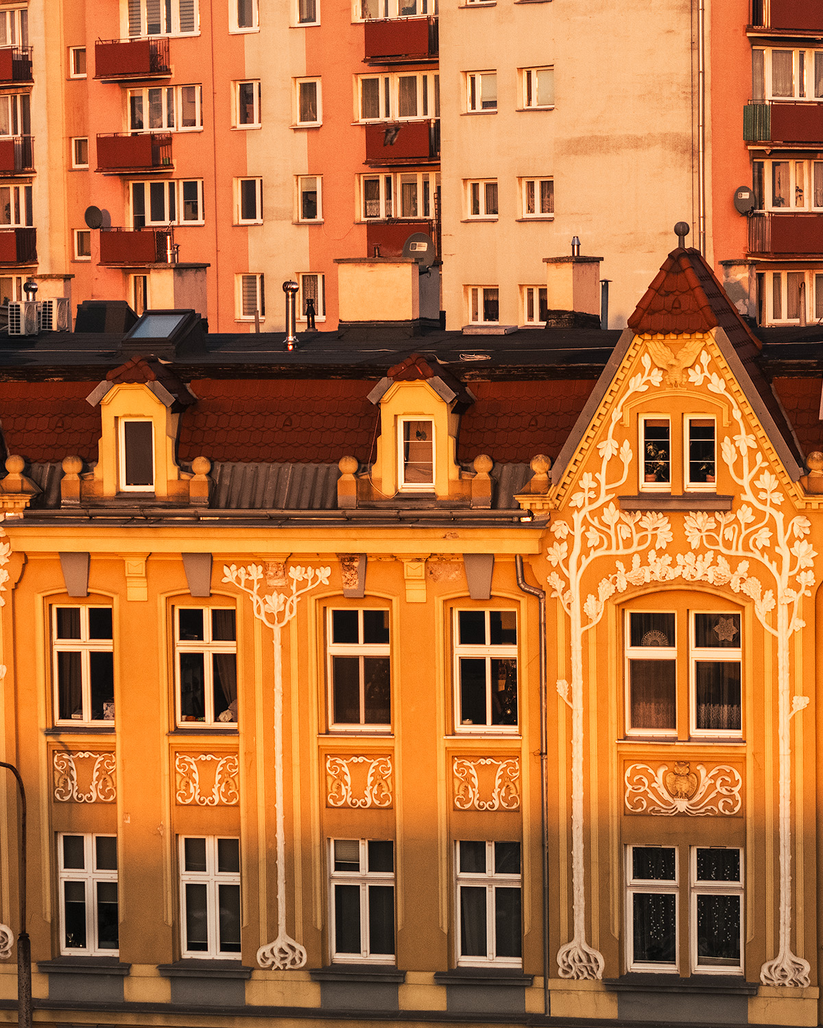Opole to miasto, gdzie nowoczesność przeplata się z historią. Z lotu ptaka wyraźnie widać, jak bloki z epoki PRL-u stoją w cieniu bogato zdobionych kamienic. Jedno z ujęć przedstawia pięknie oświetlone detale secesyjnej fasady – kunszt rzemiosła przetrwał tu dekady i dumnie kontrastuje z prostotą współczesnych budynków.