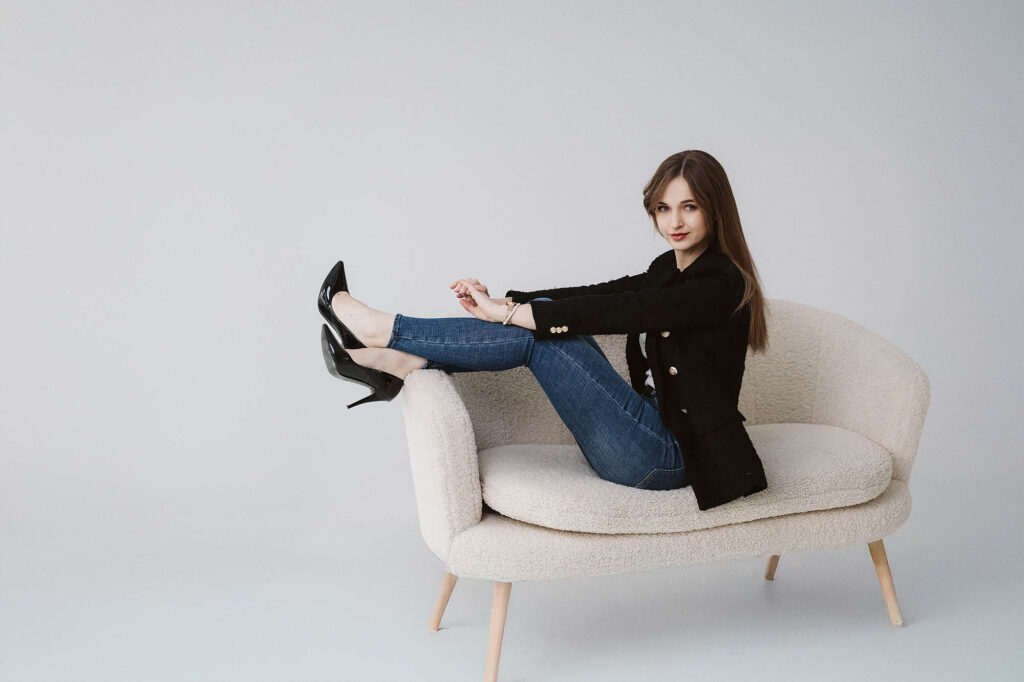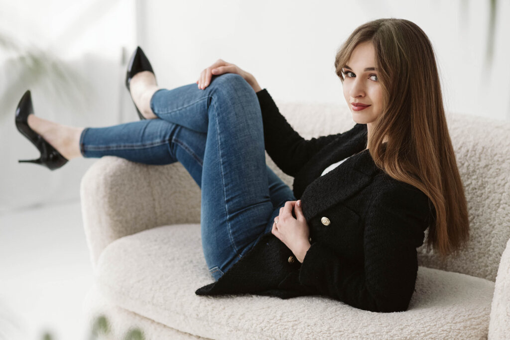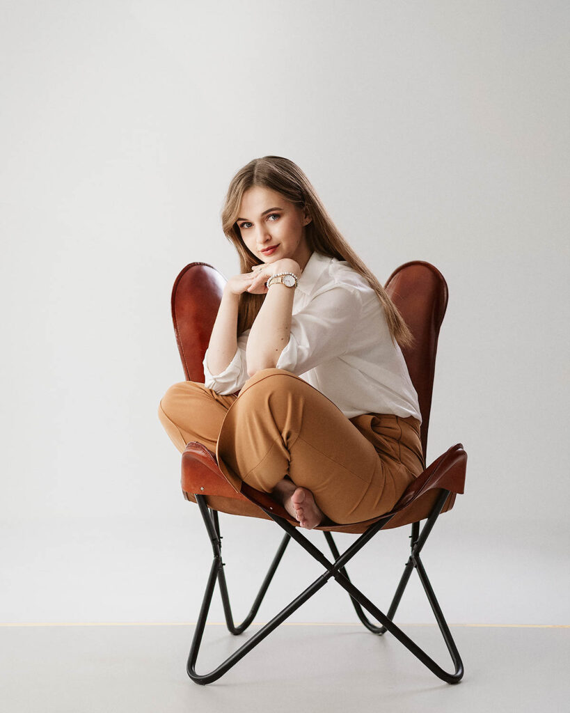Podczas każdej sesji staram się stworzyć atmosferę, w której modelka czuje się komfortowo. Dzięki temu możliwe jest uchwycenie szczerych emocji i naturalnych póz, które oddają prawdziwy charakter fotografowanej osoby. Ania zaprezentowała się w kilku odsłonach – od swobodnych ujęć na wygodnej sofie, przez klasyczne portrety w stylu business casual, aż po kobiece, lekkie kadry wśród zieleni. To pokazuje, jak szerokie spektrum stylizacji można uzyskać podczas jednej sesji.