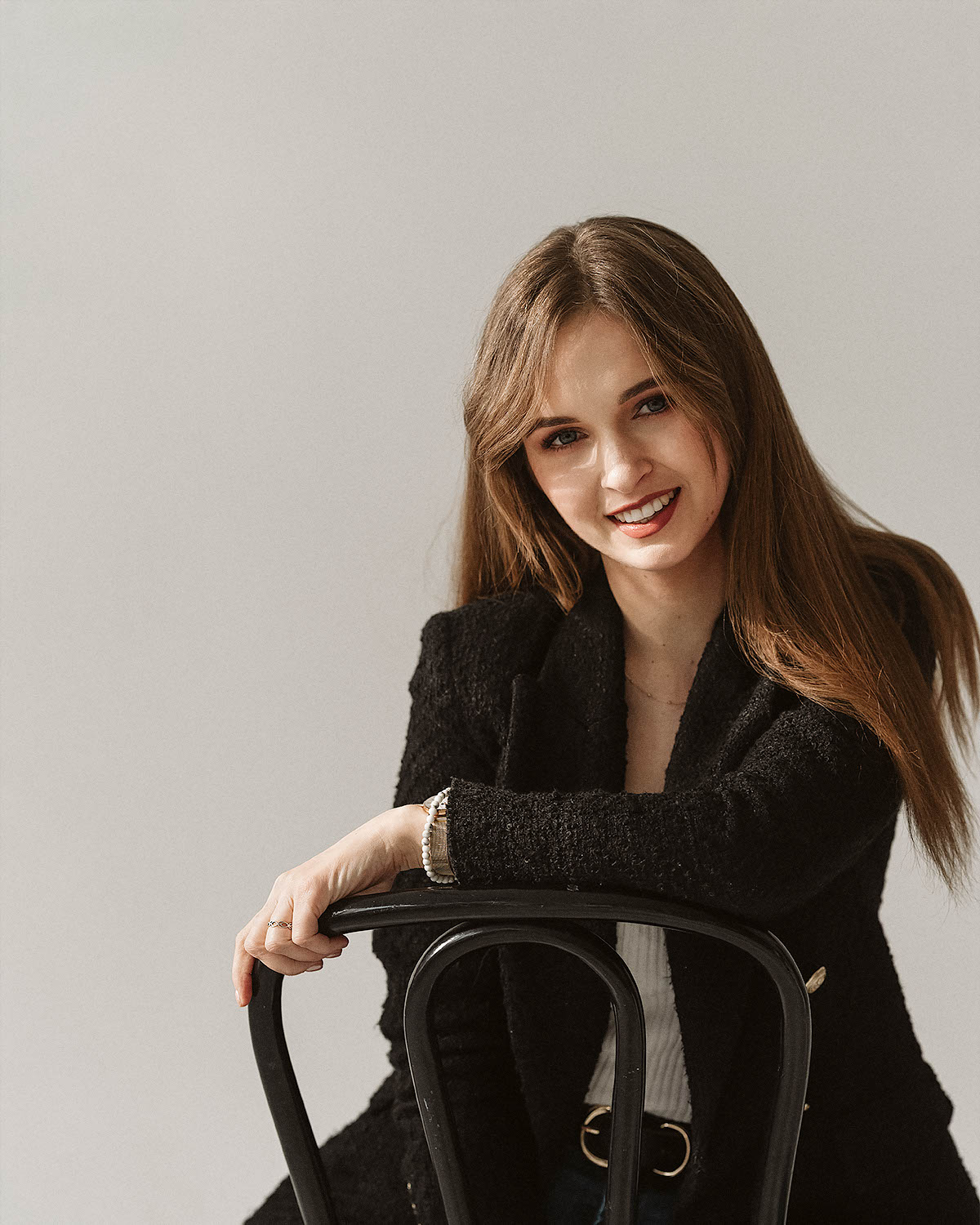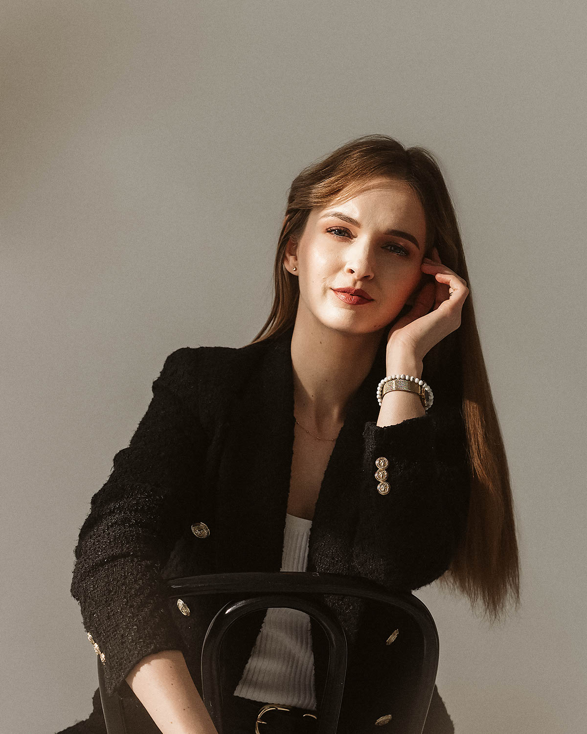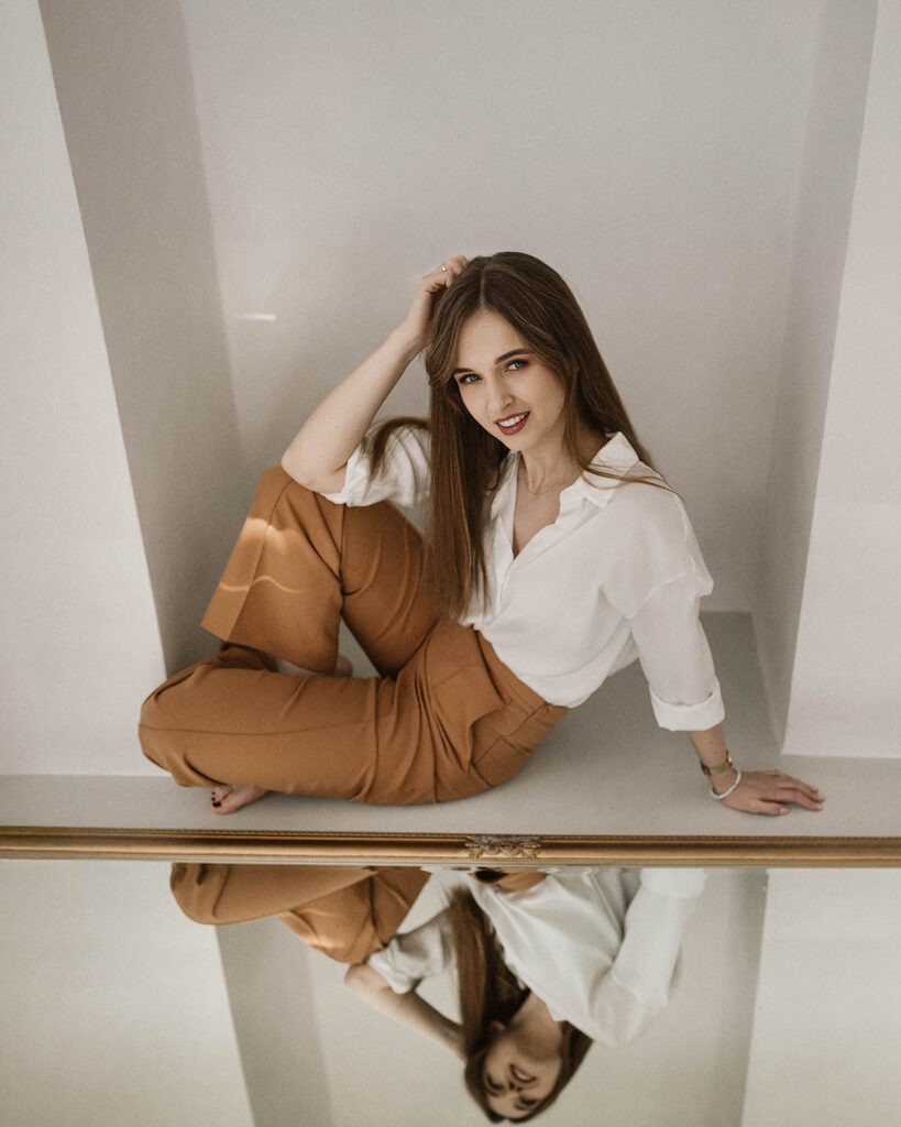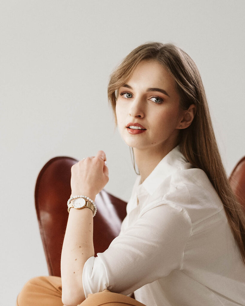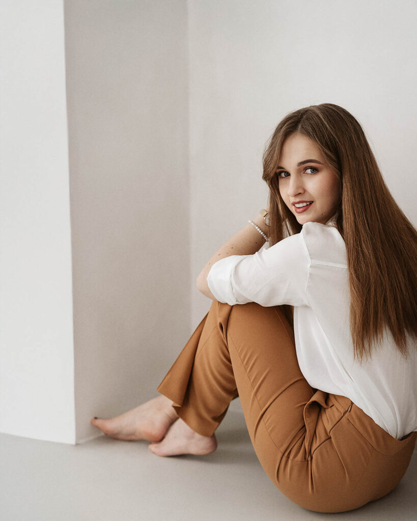 Sesja z Anią to przykład harmonijnego połączenia klasycznej elegancji i swobodnej naturalności. Delikatne, miękkie światło studyjne podkreśliło jej subtelną urodę i dodało zdjęciom lekkości. W stylizacjach postawiliśmy na neutralne, ponadczasowe kolory: biel, beże oraz klasyczną czerń, które doskonale komponują się z jasnym tłem i minimalistycznym wnętrzem. Efekt? Zdjęcia emanują klasą, a jednocześnie są pełne ciepła i autentyczności.