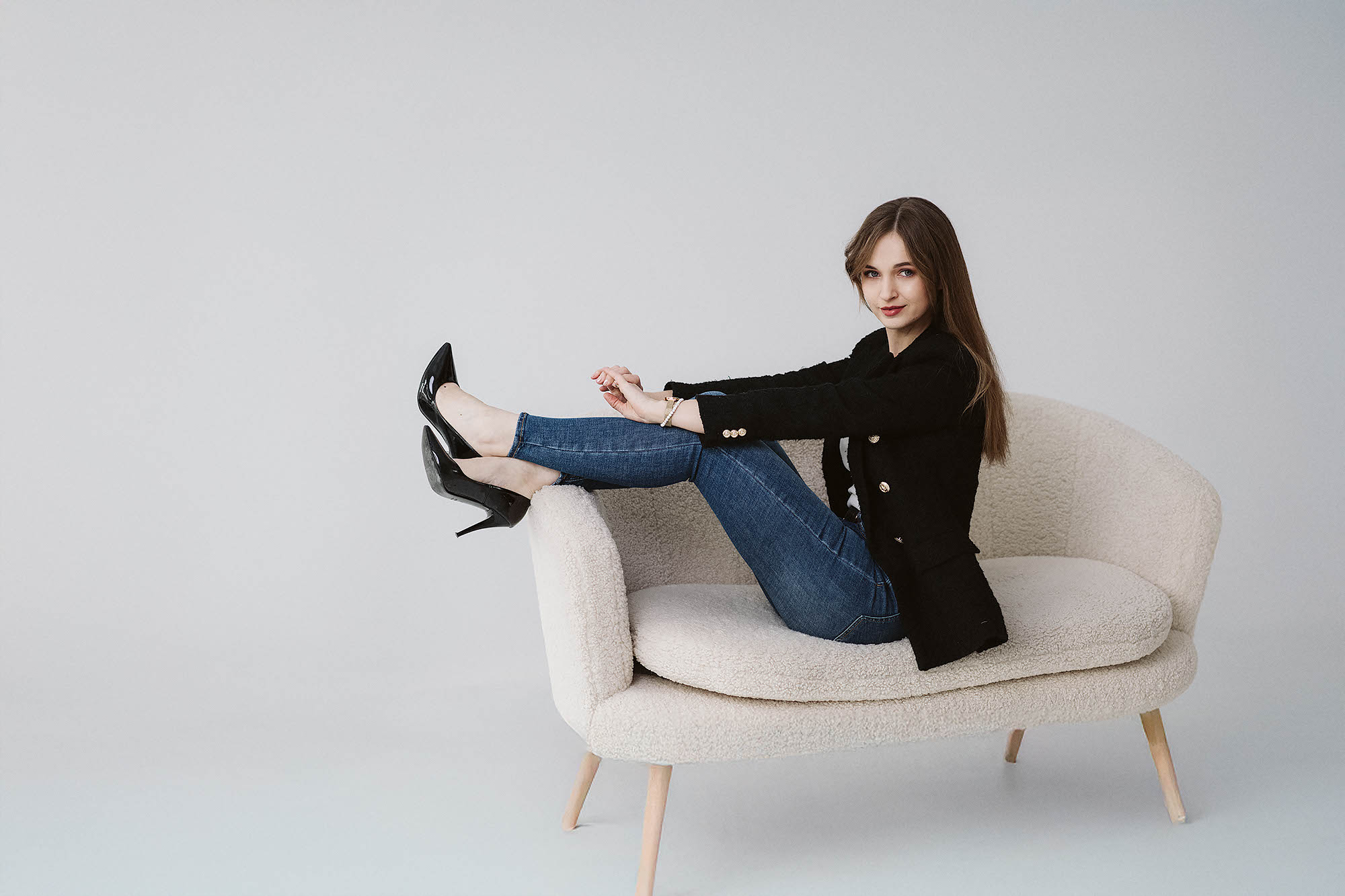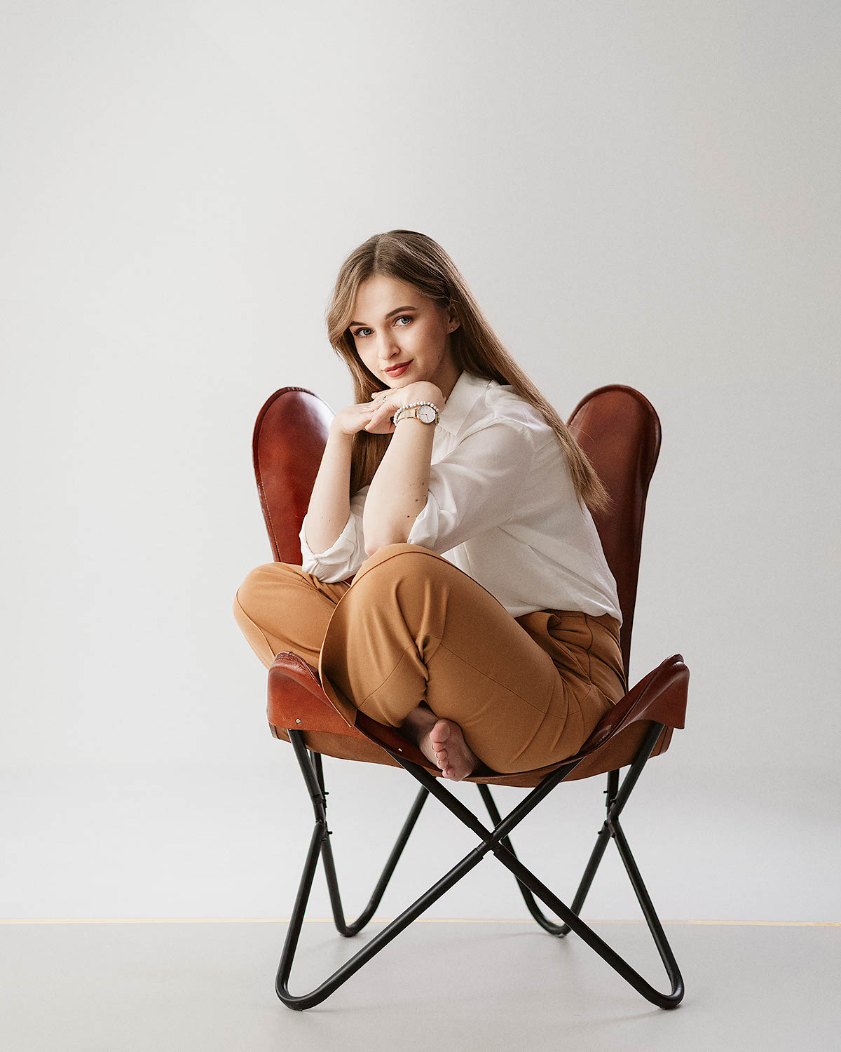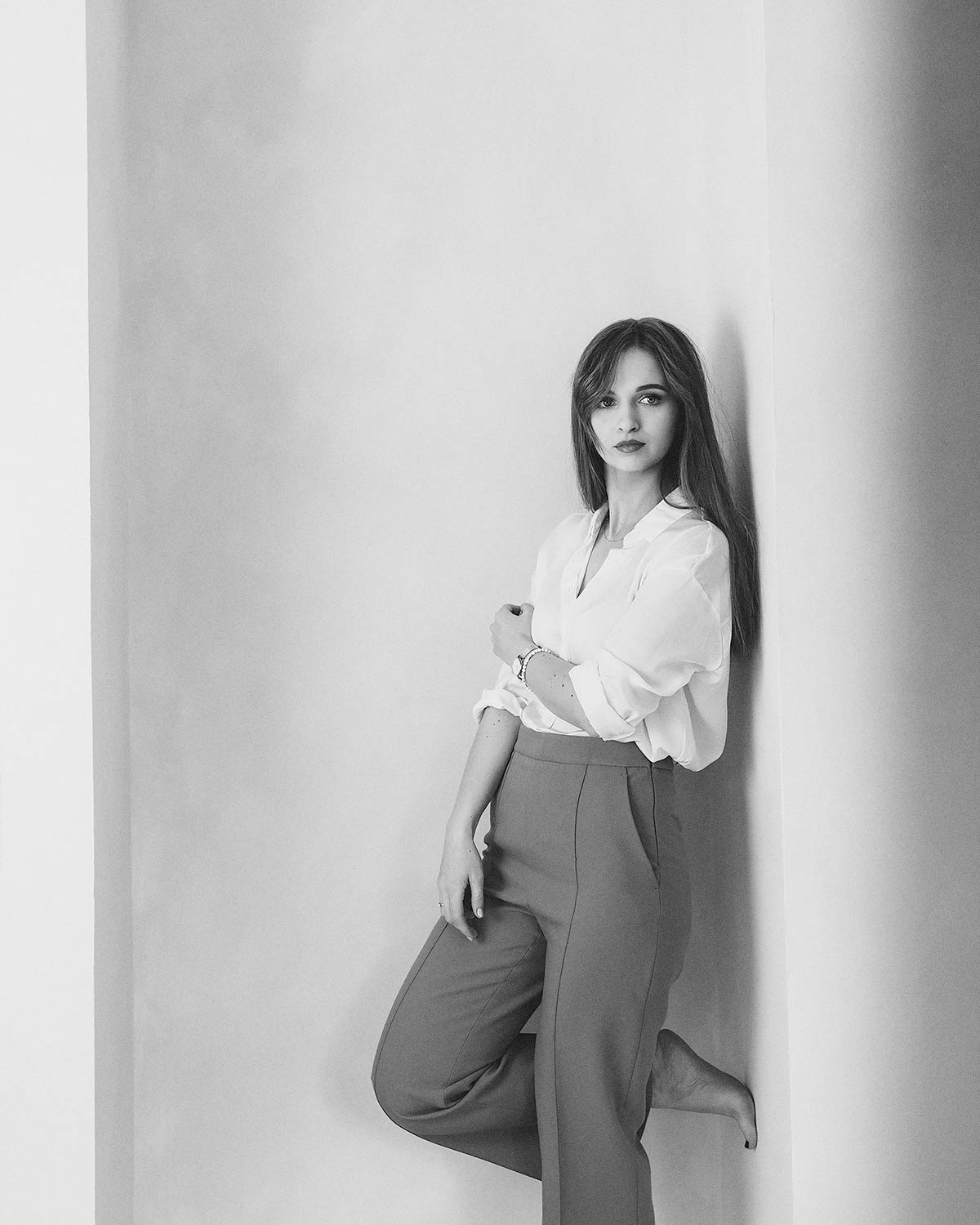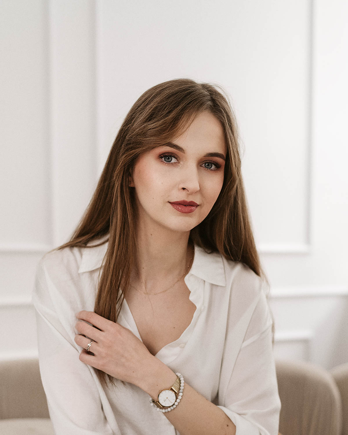 Sesja z Anią to przykład harmonijnego połączenia klasycznej elegancji i swobodnej naturalności. Delikatne, miękkie światło studyjne podkreśliło jej subtelną urodę i dodało zdjęciom lekkości. W stylizacjach postawiliśmy na neutralne, ponadczasowe kolory: biel, beże oraz klasyczną czerń, które doskonale komponują się z jasnym tłem i minimalistycznym wnętrzem. Efekt? Zdjęcia emanują klasą, a jednocześnie są pełne ciepła i autentyczności.