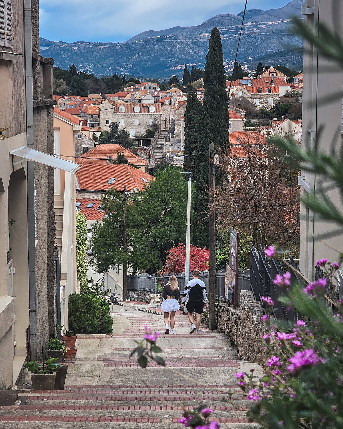 To kadr, który świetnie łączy kilka warstw: brukowana uliczka, młoda para schodząca w dół, w tle charakterystyczne czerwone dachy i majestatyczne góry. Rośliny po bokach kadru tworzą naturalne obramowanie i pogłębiają perspektywę.