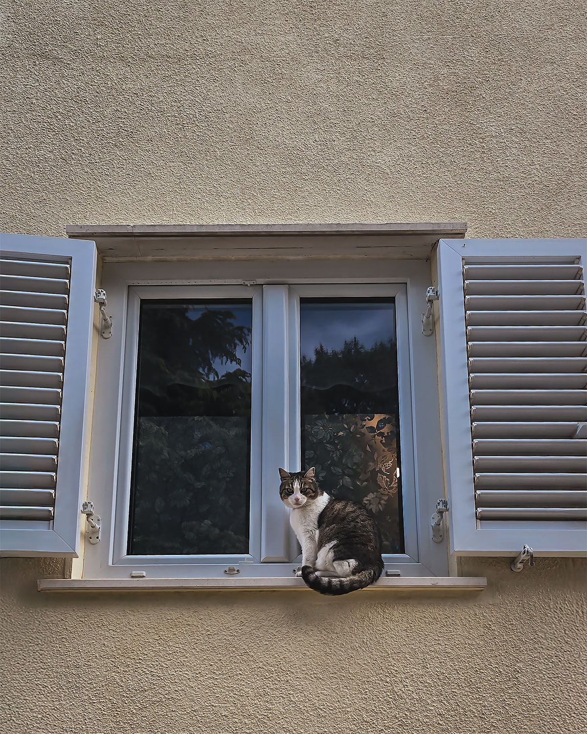 Minimalistyczna kompozycja oparta na kontrastach – jasna, gładka elewacja i białe okiennice tworzą tło dla kota, który staje się centralnym punktem. Zwierzak patrzy prosto w obiektyw, co nadaje zdjęciu charakter i sprawia, że zatrzymuje uwagę na dłużej.
