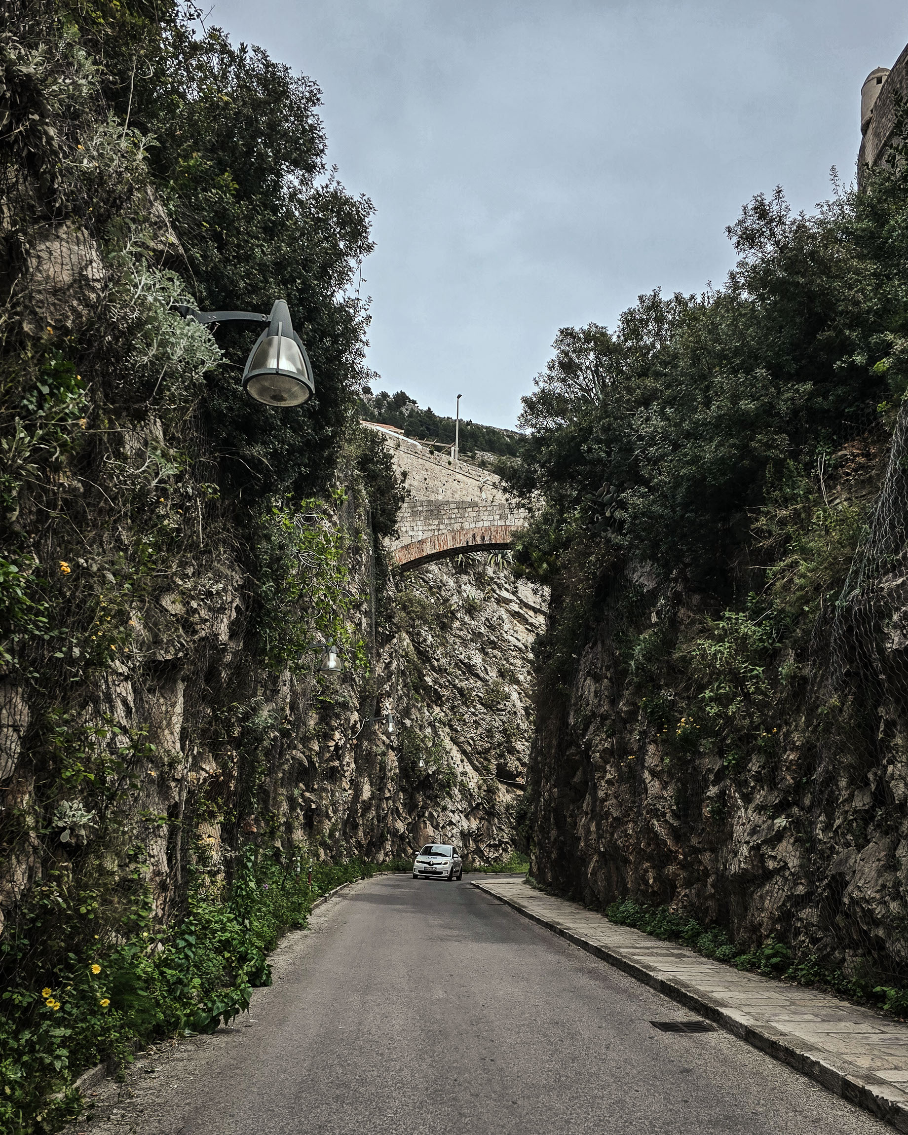 Ta dramatyczna droga wyżłobiona w skale prowadzi w kierunku plaży Sveti Jakov – jednej z mniej uczęszczanych perełek Dubrownika. Most nad drogą to fragment muru miejskiego. Kompozycja naturalnie prowadzi wzrok – najpierw ku samochodowi, potem ku mostowi, a dalej – ku niebu.