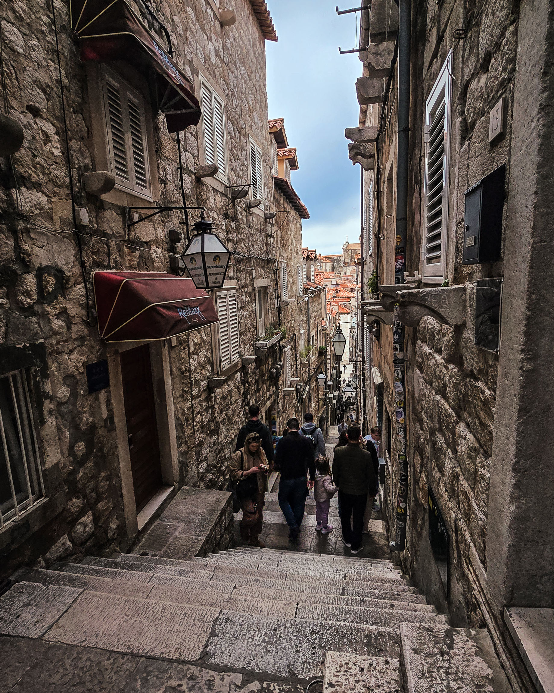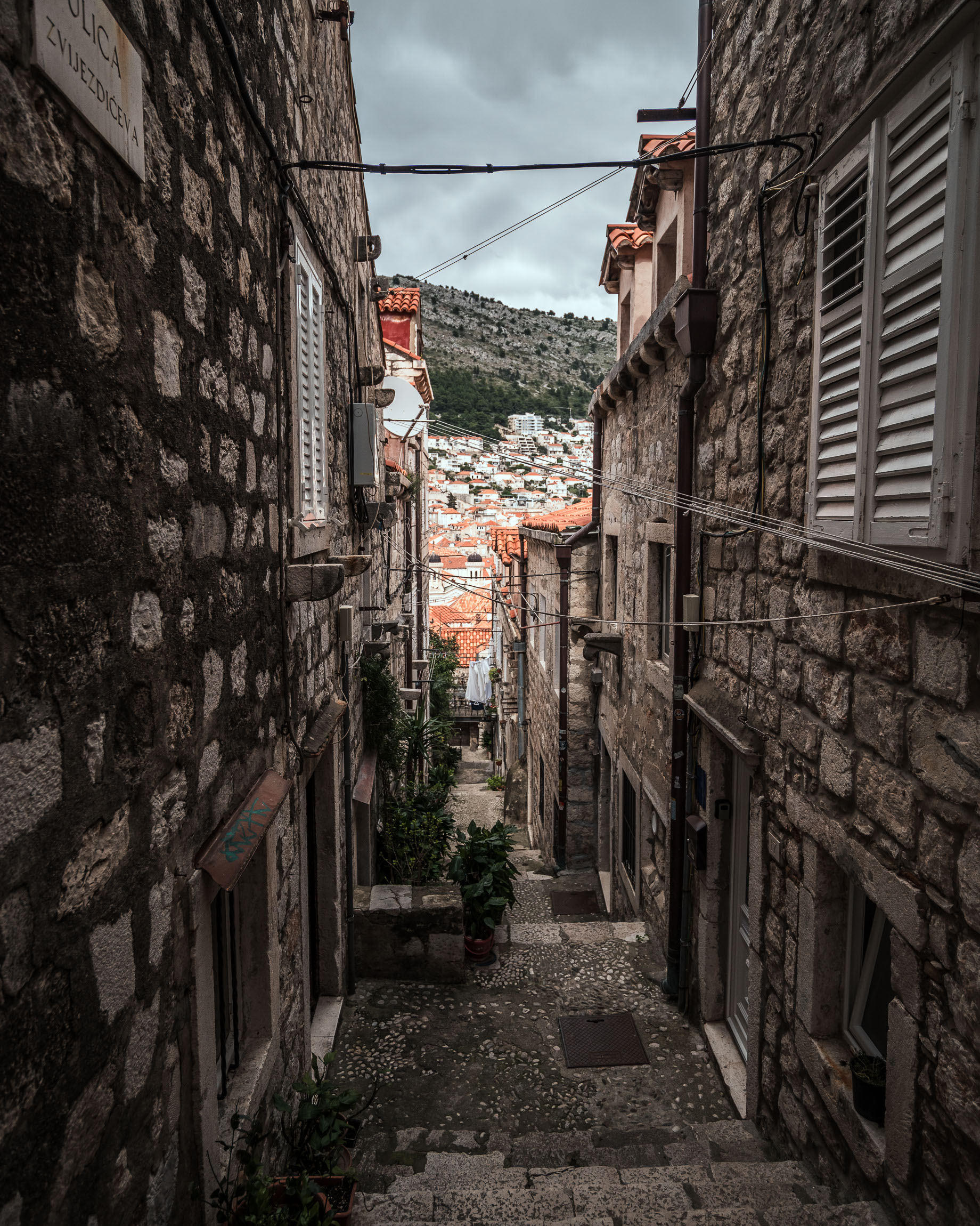 Kolejna klasyczna dubrownicka uliczka, ale tym razem z pięknym widokiem na czerwone dachy i zbocza nad miastem. Ulica nieco w cieniu, ale tło rozświetlone – kontrast, który robi robotę.