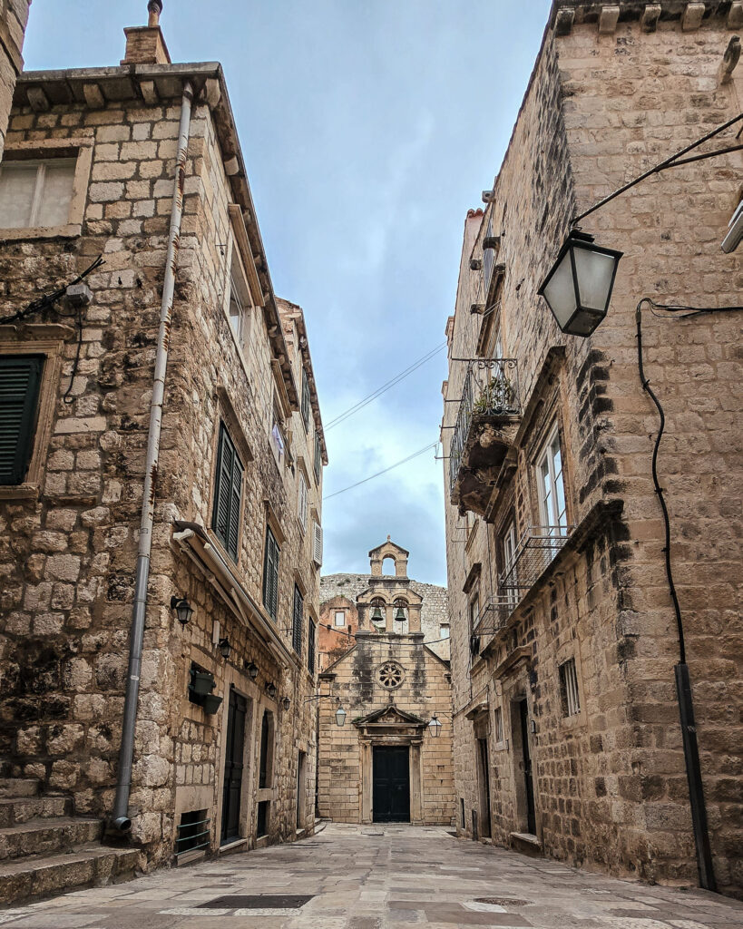 To jedno z tych miejsc, które powinni znać wszyscy fani „Gry o Tron” – bo właśnie tu rozgrywały się sceny z „marszu pokuty” Cersei. To ul. Boškovićeva lub jedna z równoległych, które prowadzą stromo w dół od zachodniego krańca Stradunu. W tle – dachy miasta i wieże kościołów.