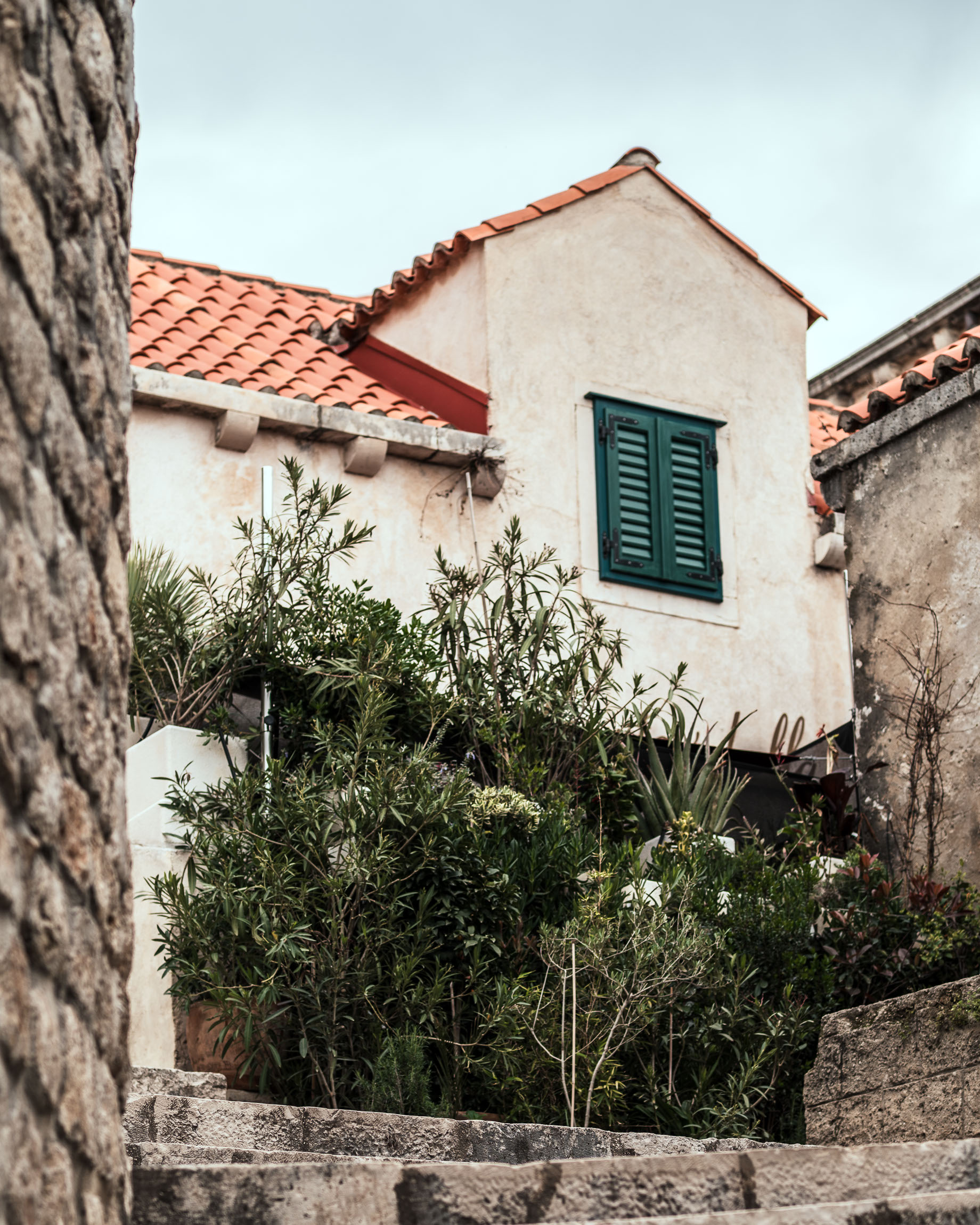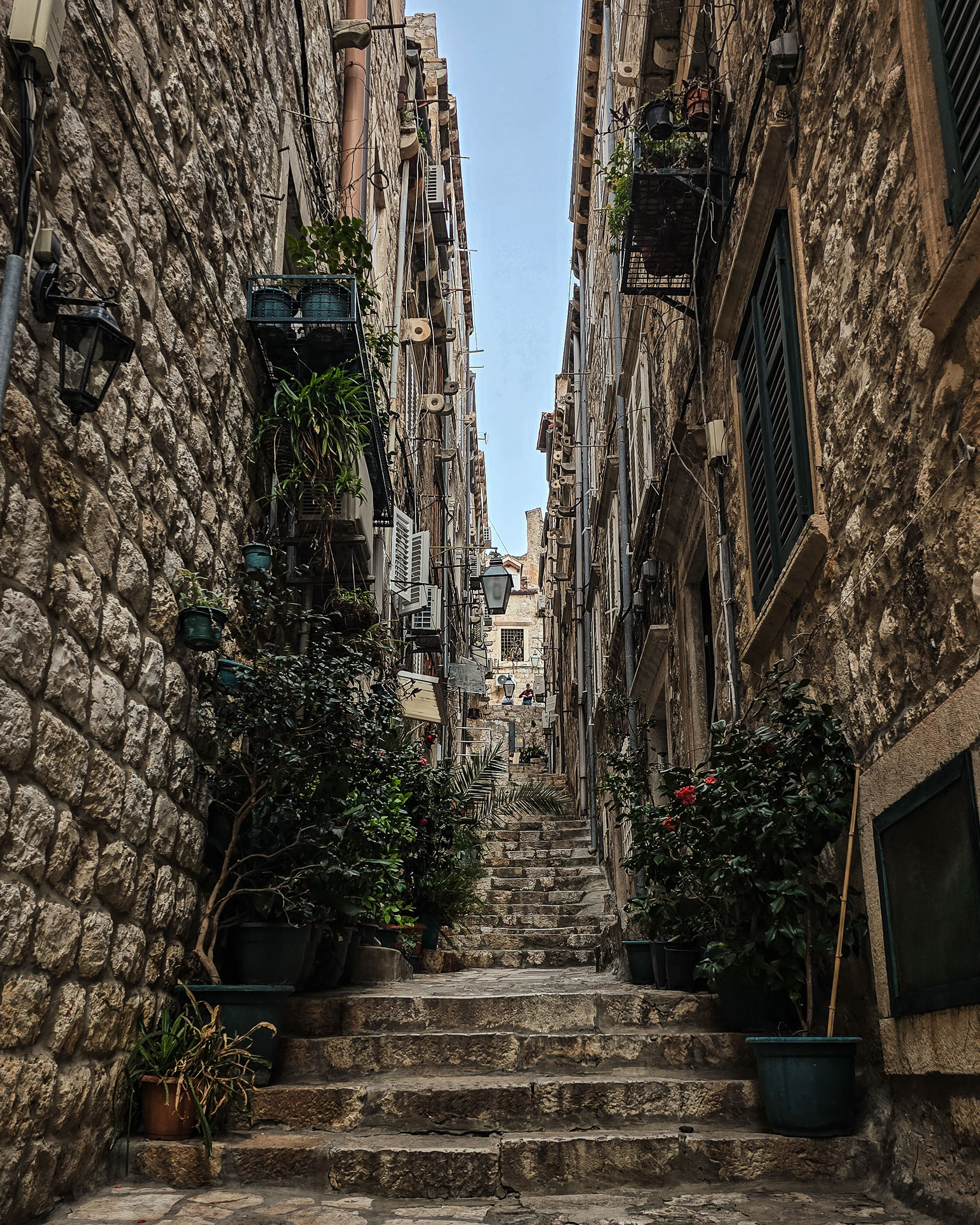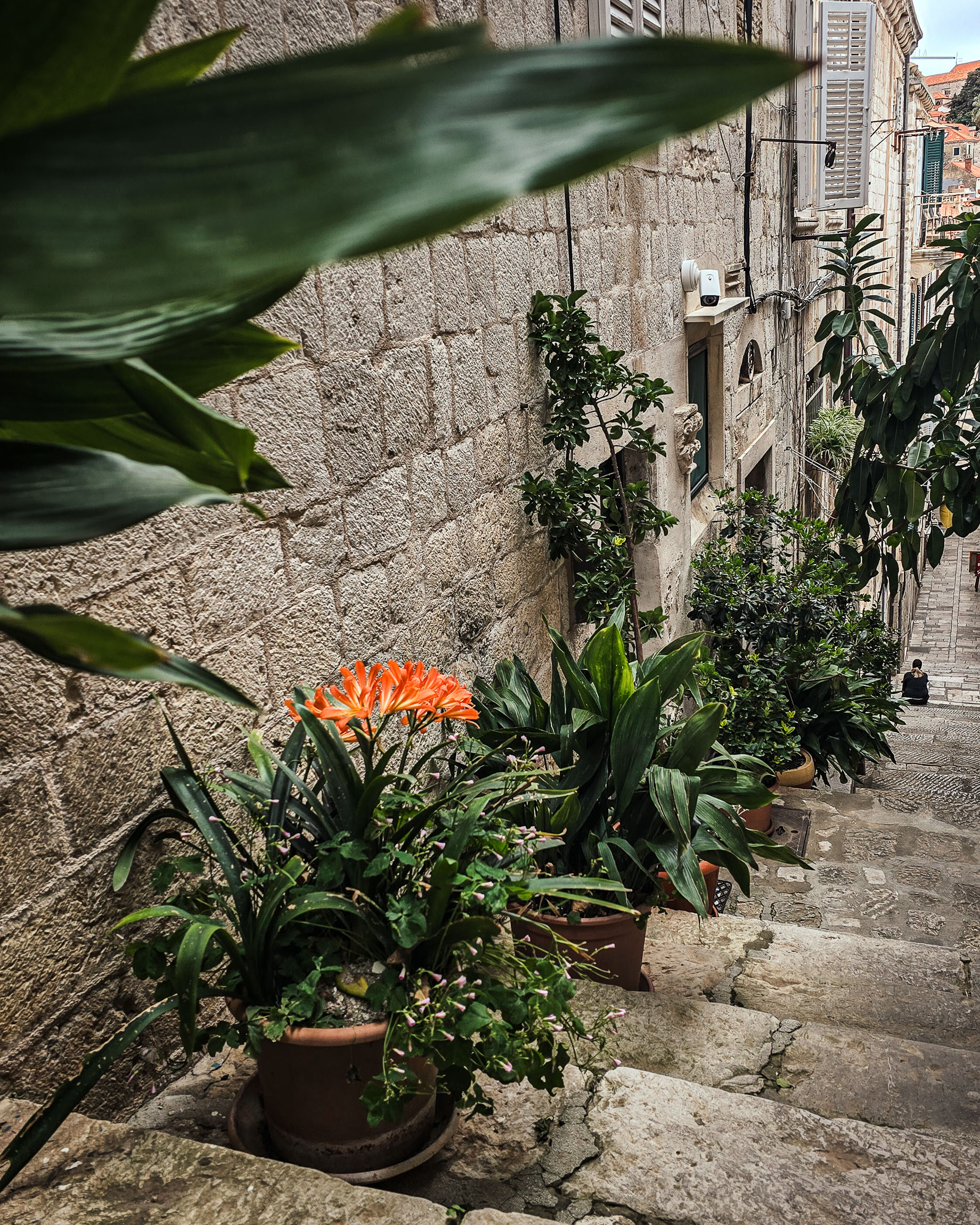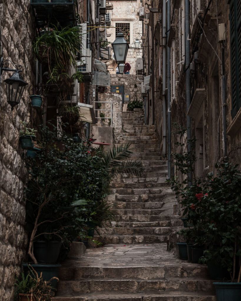 To jedno z najbardziej „dubrownickich” zdjęć w klasycznym znaczeniu: strome schody, ściany z jasnego kamienia i balkoniki uginające się pod doniczkami. Zieleń kontrastuje tu z szarością, tworząc malarski klimat.