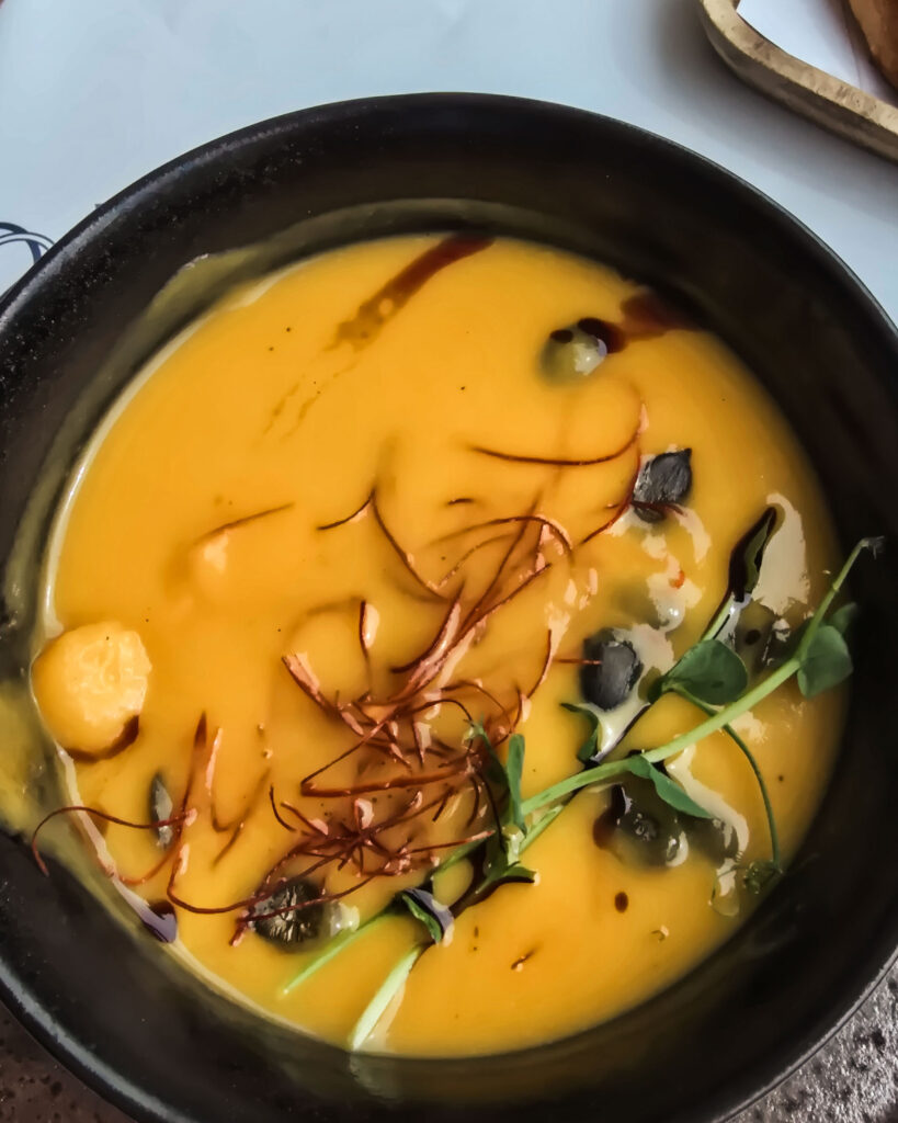 Zwieńczeniem dnia była wizyta w Poklisar Restaurant – tuż przy porcie. Zupa dyniowa, którą zamówiłem, była absolutnym strzałem w dziesiątkę. Aksamitna, głęboka w smaku, z dodatkiem cienko pokrojonego chili, które subtelnie podbijało całość nutą pikantności. Do tego świeże, chrupiące pieczywo z oliwą i czosnkiem – proste, a jakże doskonałe.
