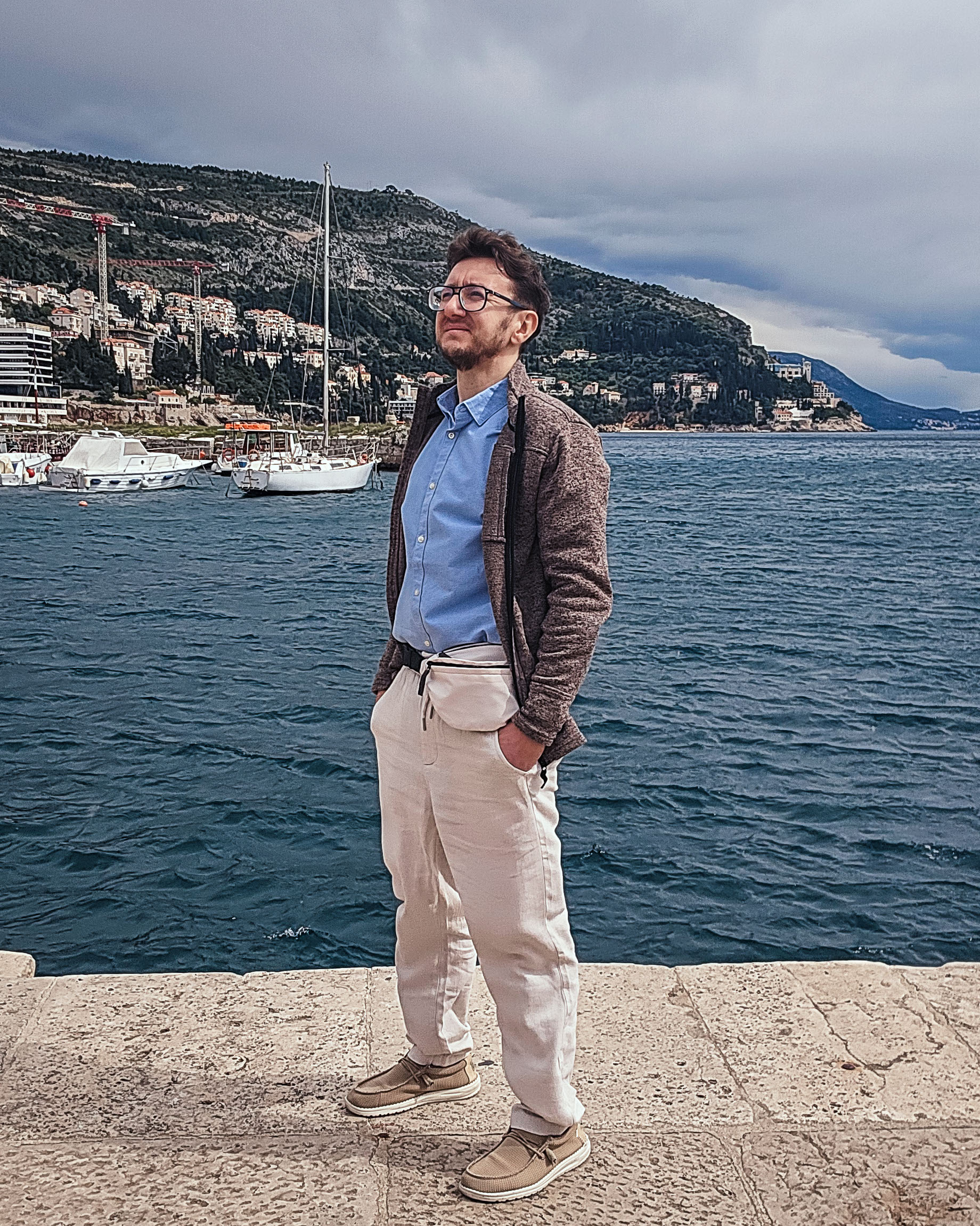 Zanim słońce na dobre zaszyło się za dachami Dubrownika, postanowiłem zatrzymać ten dzień także w innej formie – portretem na tle wybrzeża. Wiatr wciąż był obecny, ale światło rozproszone przez chmury dodawało zdjęciu miękkości i nostalgii. W takich momentach lubię stanąć na chwilę, spojrzeć przed siebie i po prostu poczuć – gdzie jestem i jak bardzo warto było tu być.