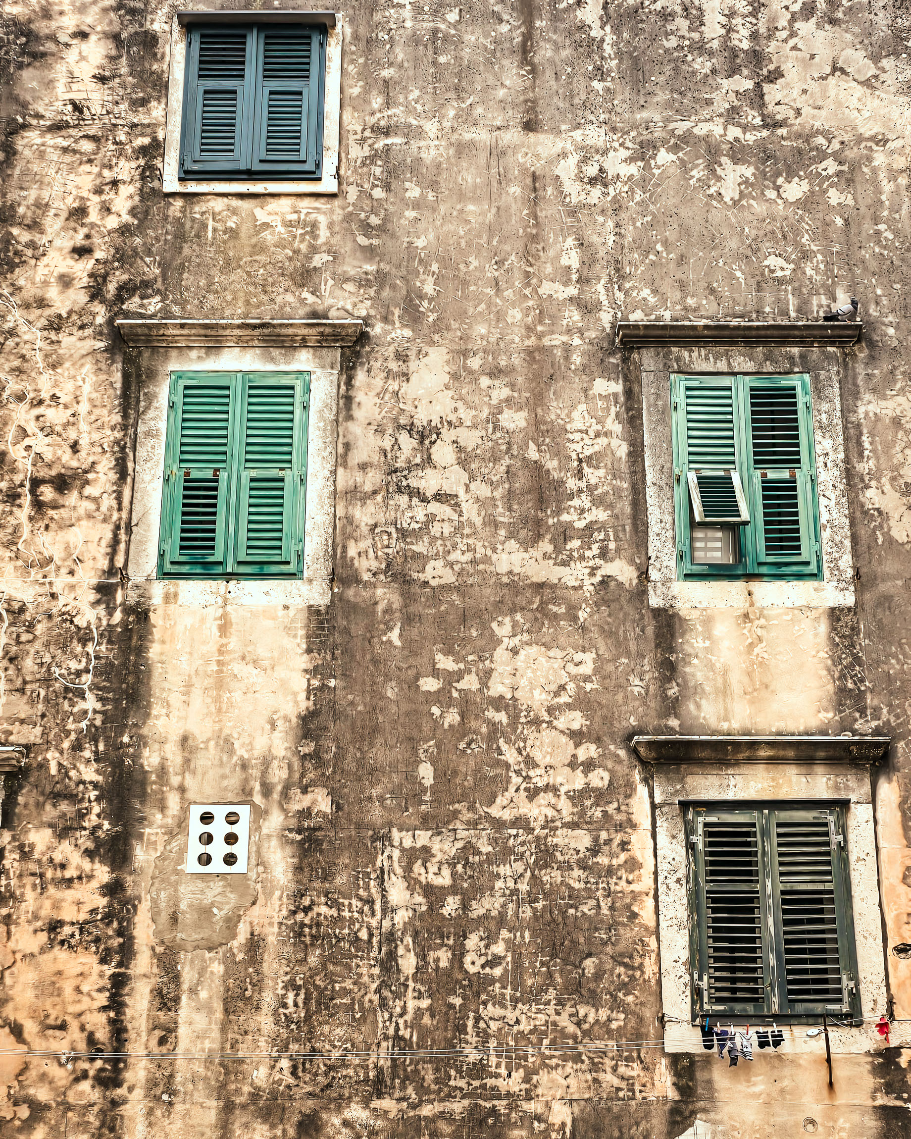 Minimalistyczna fasada kamienicy z podniszczonym tynkiem i pastelowymi okiennicami. Kadr opiera się na rytmie – powtarzalność okien i tekstura ściany tworzą prawdziwą fotograficzną gratkę dla miłośników geometrii i faktury.