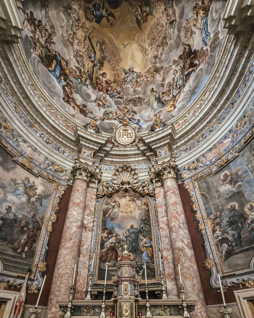 Barokowy przepych w pełnej krasie! Wnętrze Kościoła św. Ignacego zachwyca detalem, światłem i potęgą malarstwa iluzjonistycznego. Szerokokątny obiektyw pozwolił objąć całe prezbiterium, tworząc wrażenie monumentalności.
