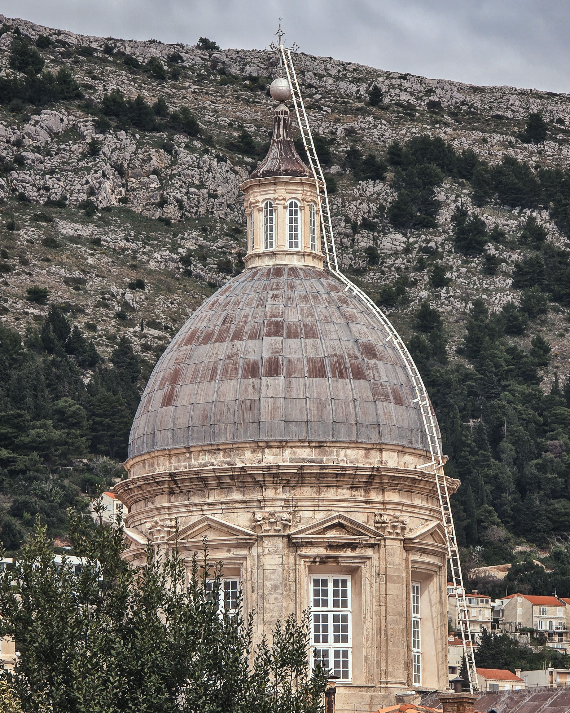 Kopuła jednej z najważniejszych świątyń miasta wyłania się zza dachów z monumentalnym spokojem. Tło w postaci zbocza wzgórza dodaje przestrzeni i kontrastu. Kadr wykonany obiektywem tele – pozwolił skompresować perspektywę.