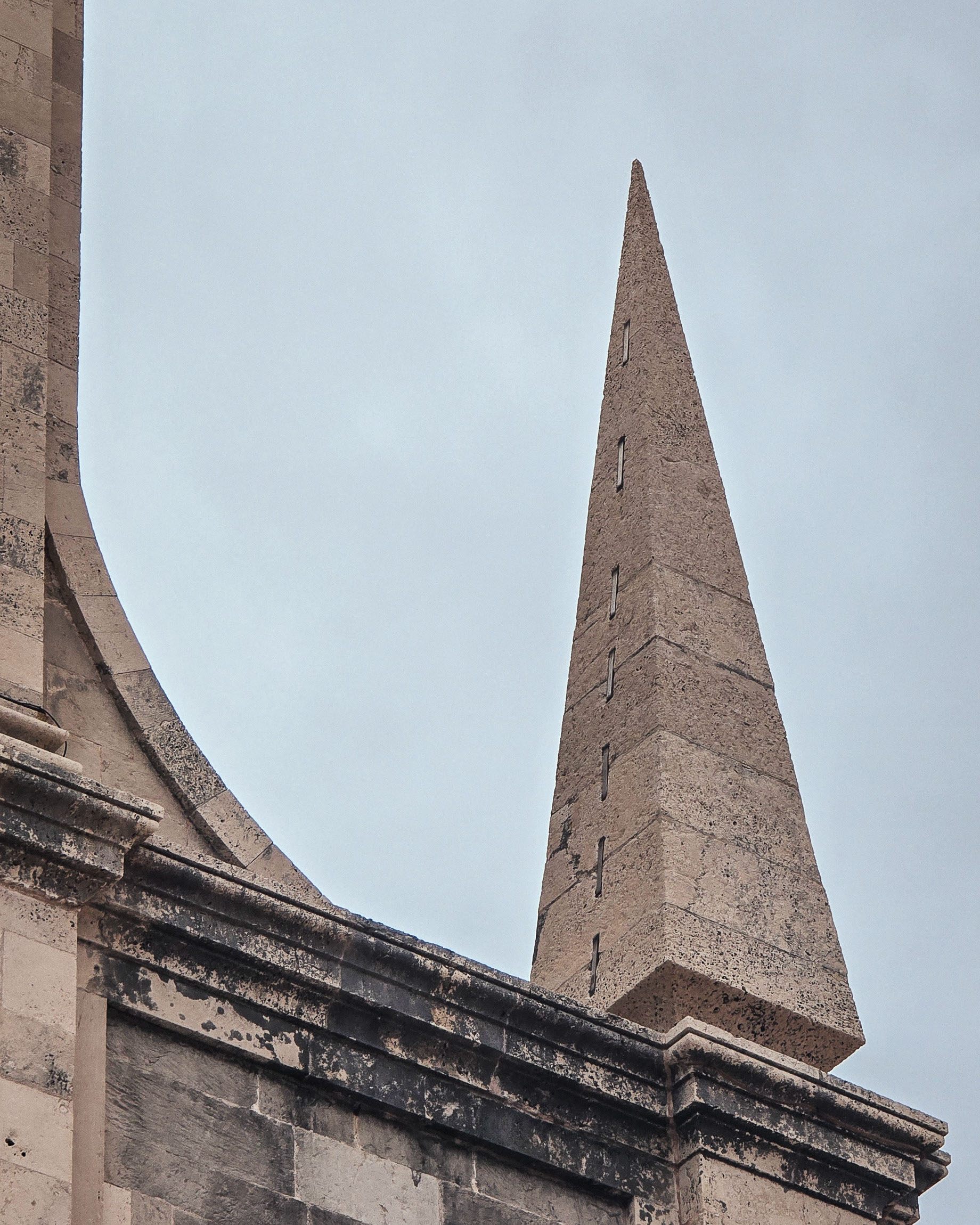 Geometryczny detal – ostrosłup na tle pochmurnego nieba. Bardzo oszczędna kompozycja, która działa dzięki kontrastowi kształtów. Niepozorne elementy potrafią przyciągnąć oko bardziej niż cały budynek.