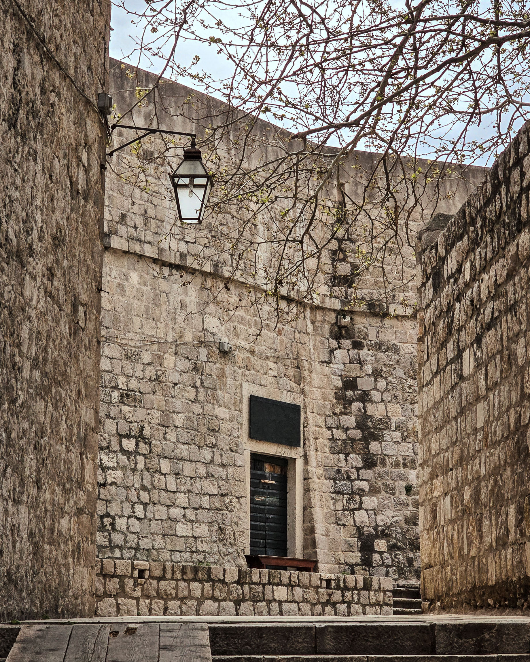 Kadr zamknięty, niemal intymny. Czarna latarnia pod gałęziami wiosennego drzewa w kontrze do surowych murów – prosty, ale pełen nastroju. Kompozycja oparta na trójkącie: gałęzie – latarnia – drzwi.