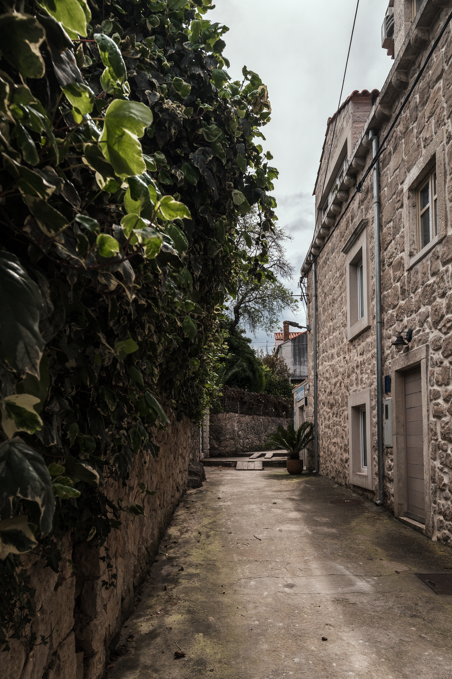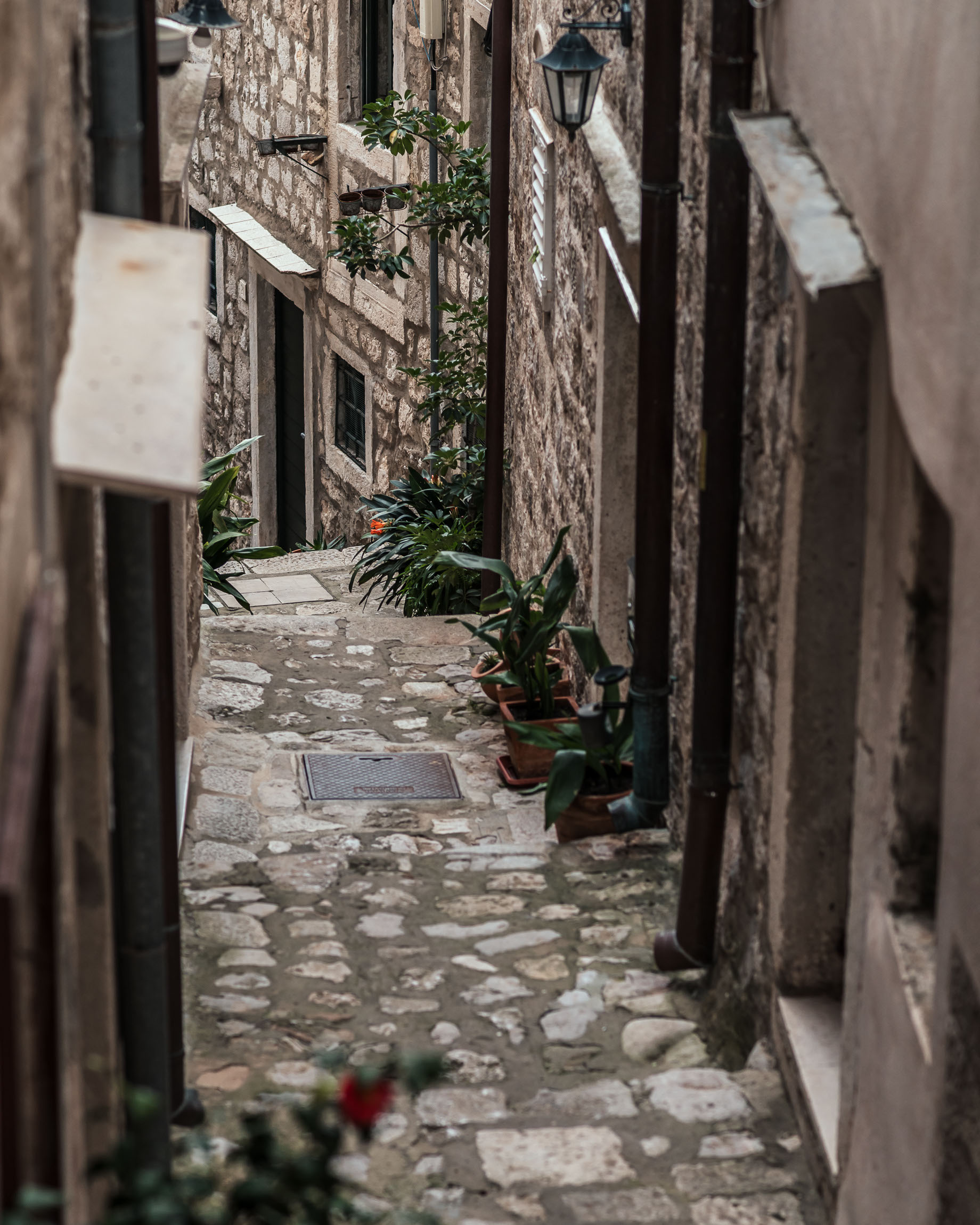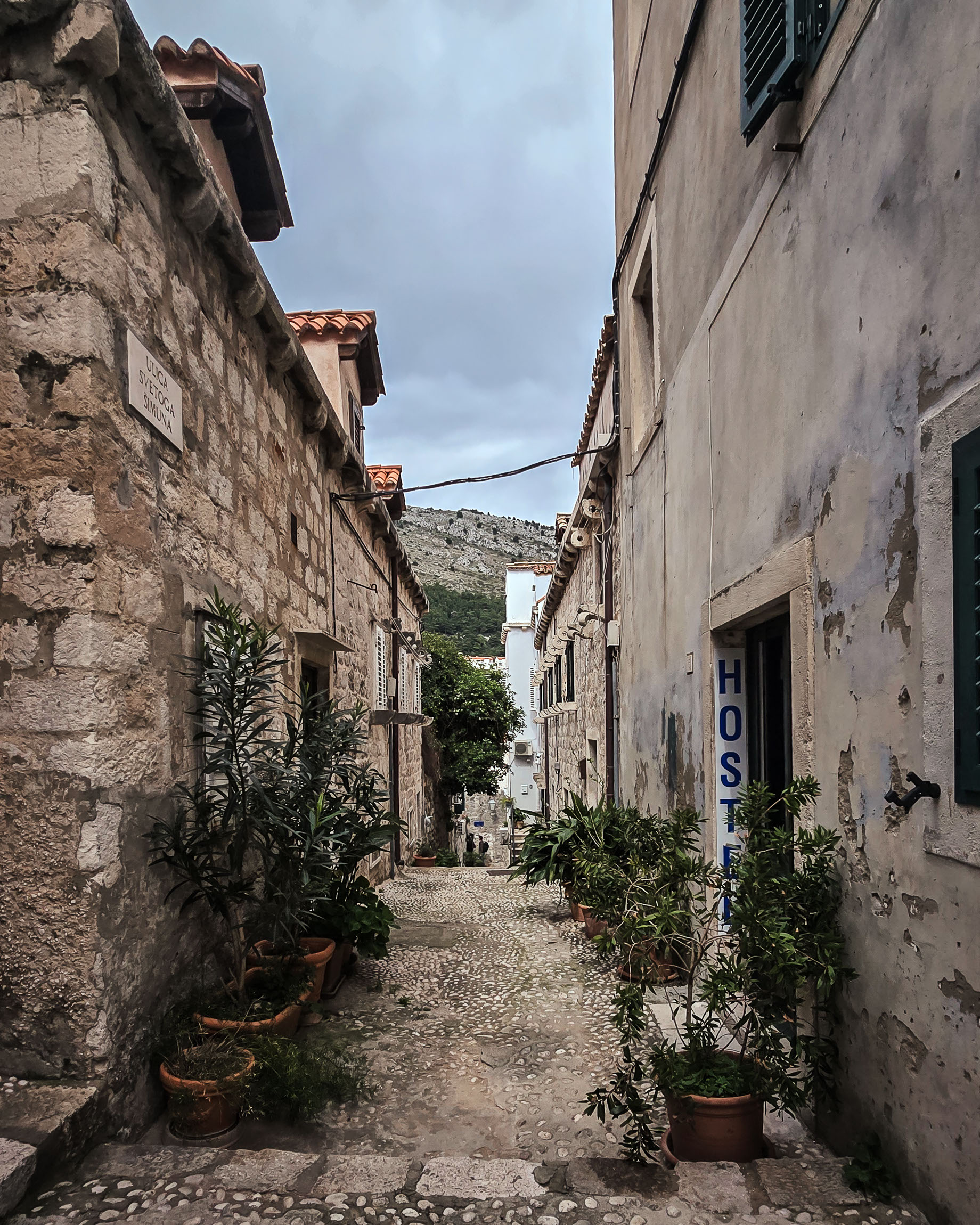 Nastrojowa uliczka z widokiem na wzgórze. Zieleń w donicach po obu stronach kadru tworzy naturalną ramę, a głębia prowadzi wzrok w stronę światła. Typowy dubrownicki klimat – kamień, roślinność i cisza.