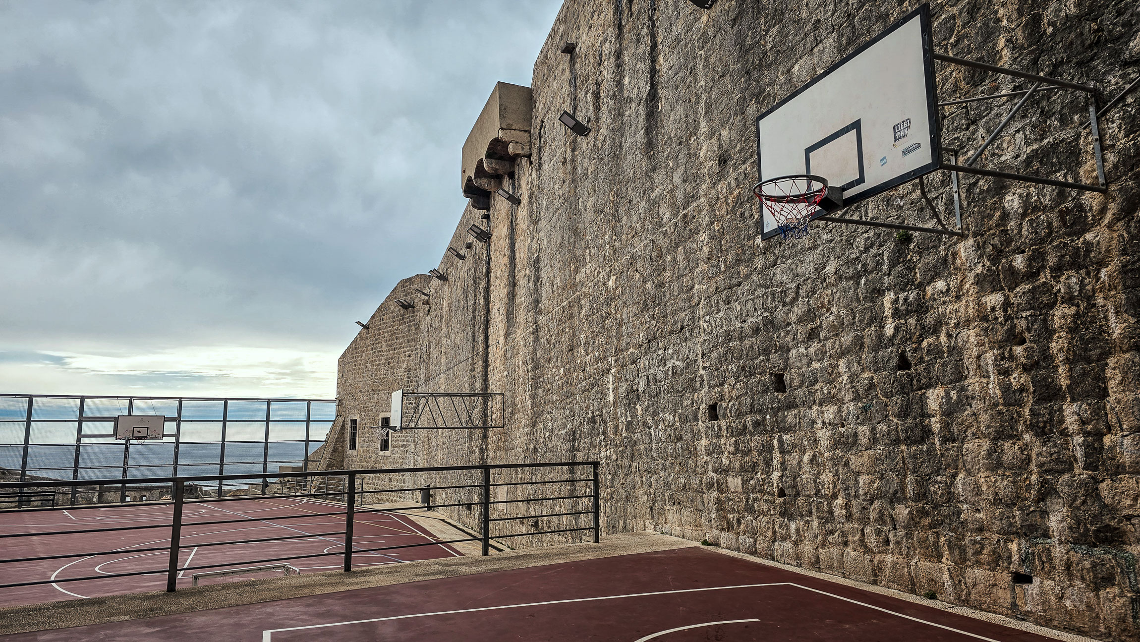 To chyba najbardziej nietypowe miejsce do gry w kosza, jakie widziałem – otoczone historycznymi murami Dubrownika, a w tle Adriatyk. Połączenie nowoczesności ze średniowiecznym klimatem. Symetria tablic i linie boiska wciągają wzrok w głąb zdjęcia.