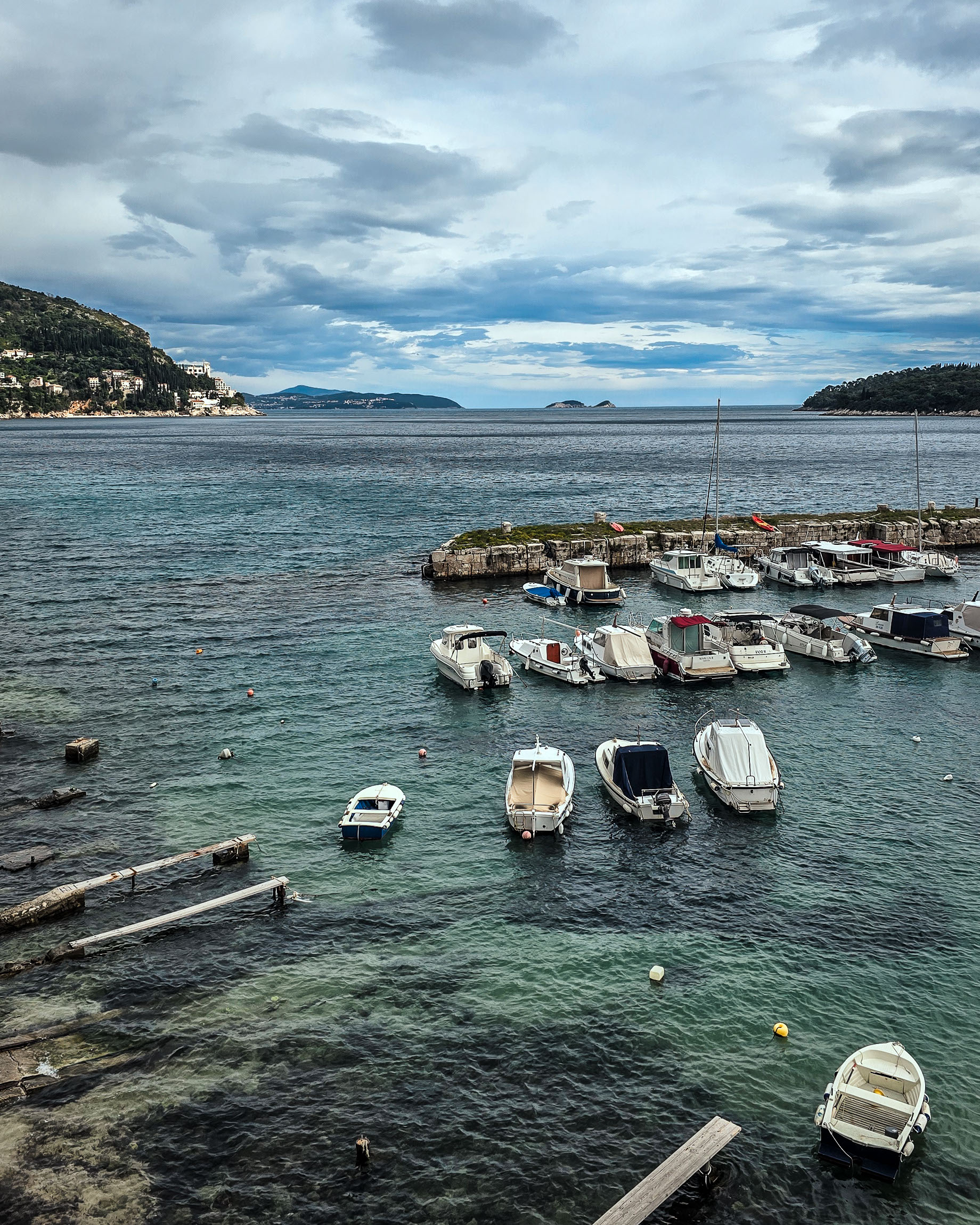 Cavtat okazał się spokojnym rajem. Nabrzeże — surowe, kamienne, zanurzone w szumie wody — wciągnęło mnie od pierwszych kroków. Miejscowość jest jak pocztówka, ale taka, którą chcesz zapisać własnymi słowami. Uliczki wiją się wśród domów z czerwonymi dachami, a światło odbijające się od białych ścian miesza się z cieniami palm i smugami chmur.