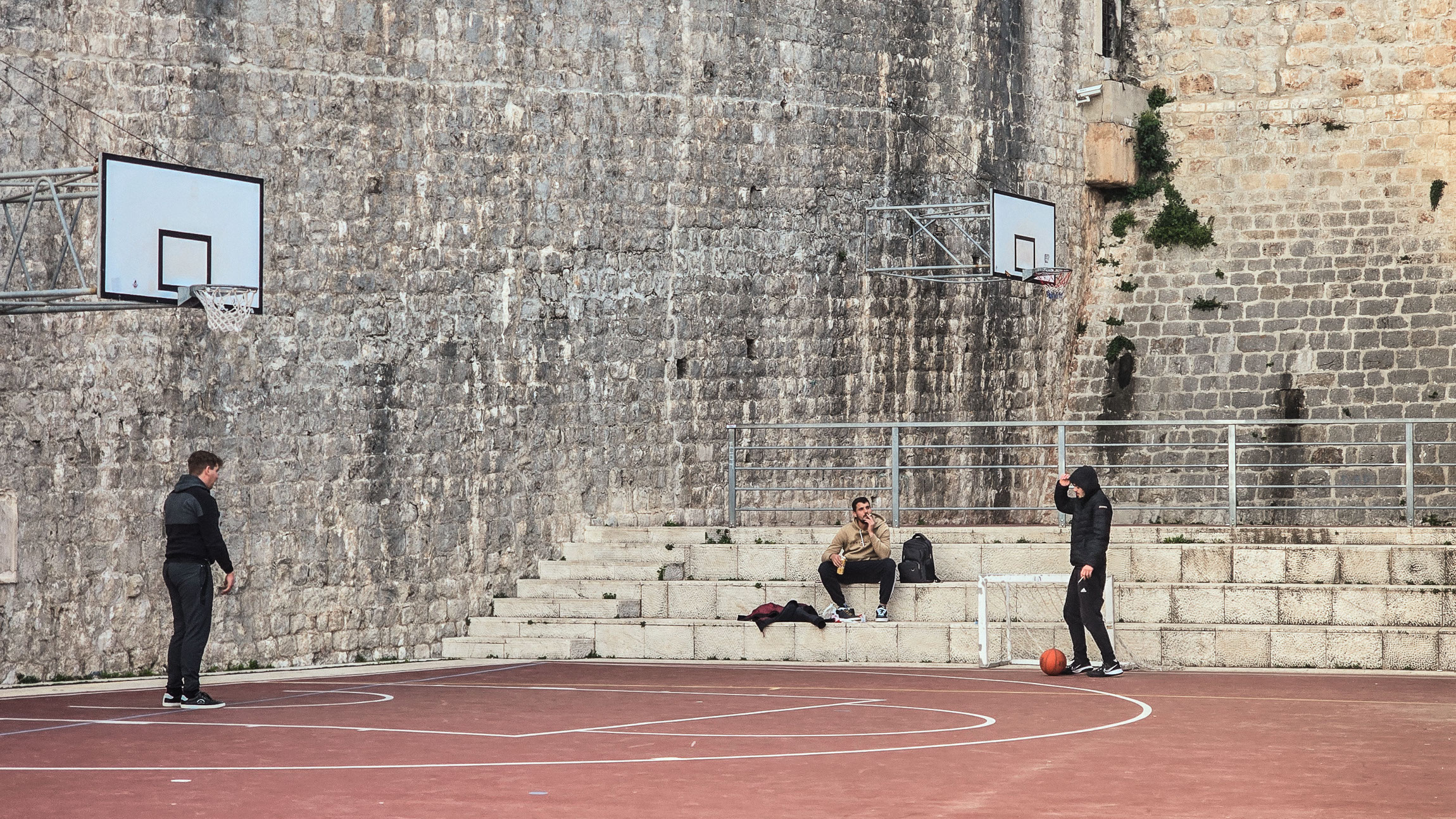 W tej scenie sport i historia przenikają się w najbardziej nieoczekiwany sposób. Na tle monumentalnych, surowych murów miejskich toczy się zwykła, codzienna rozgrywka – trochę rzucania do kosza, trochę rozmów na schodach. Minimalistyczna kompozycja i ciepłe światło końcówki dnia nadają zdjęciu niemal malarskiego spokoju.