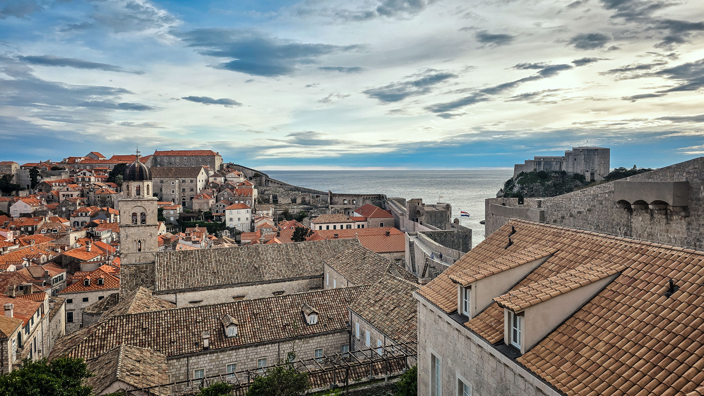 Widok z murów – dachy starego miasta, dzwonnica, twierdza Lovrijenac i w tle Adriatyk. Jeden z tych widoków, które trzeba zobaczyć na własne oczy, ale i dobrze sfotografować. Symetria dachów przełamana wieżami i falującą linią murów tworzy świetny rytm.