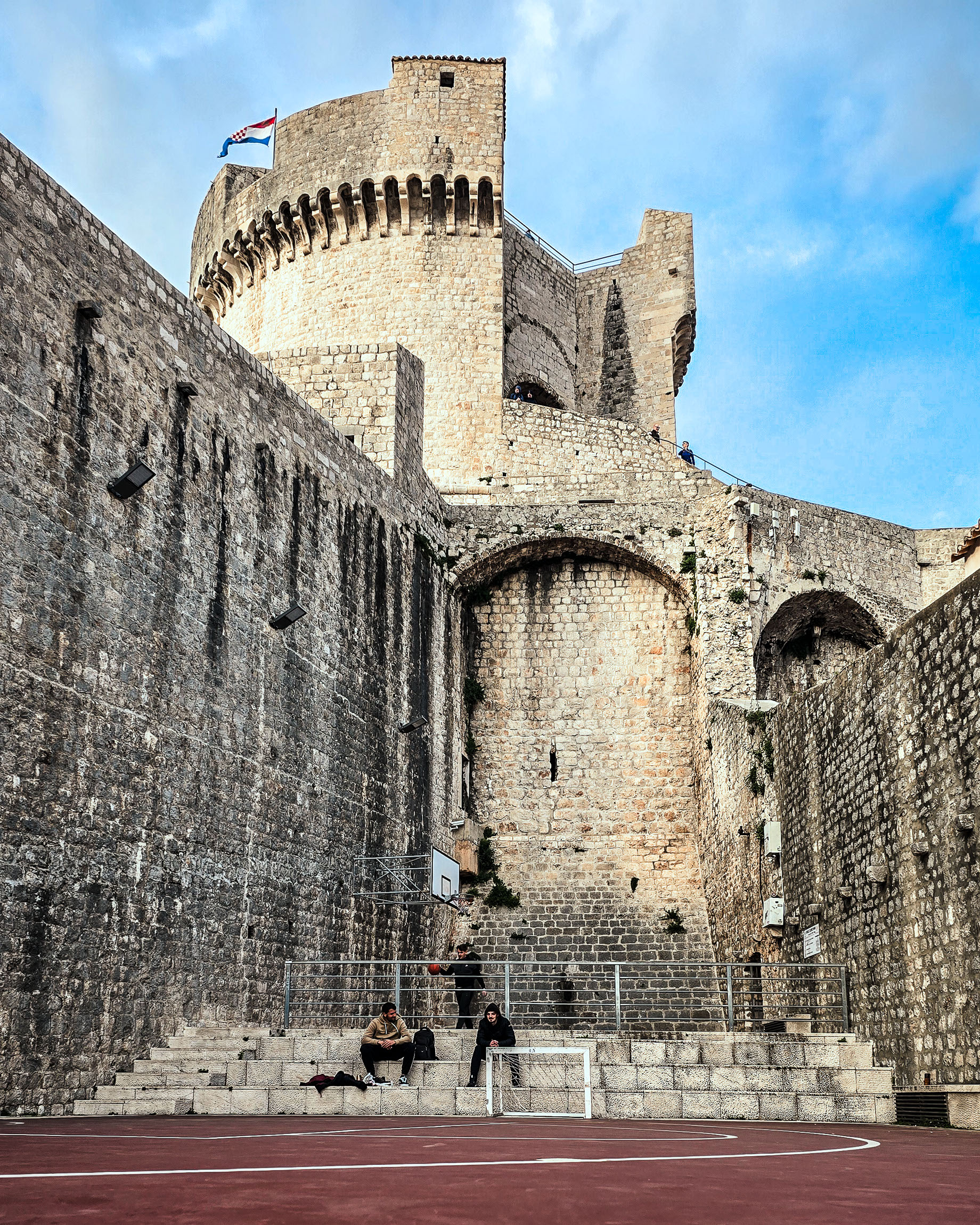 To jedno z moich ulubionych zestawień – w dole codzienność młodych ludzi grających w kosza, a nad nimi średniowieczny Fort Minčeta z powiewającą chorwacką flagą. Zdjęcie aż kipi kontrastem: przeszłość i teraźniejszość, obrona i zabawa, surowość kamienia i miękkość ludzkiej obecności. Kompozycyjnie ująłem scenę w pionie, by prowadzić wzrok z dołu – od boiska – aż po górną część fortyfikacji.