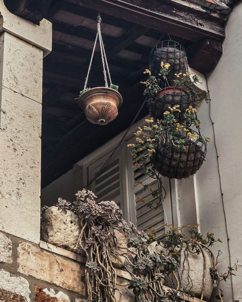 To detal architektury, który opowiada historię o mieszkańcach – zasuszone rośliny, gliniane donice i trochę chaosu. Kadr zbliżony, pełen faktur, idealny przykład na to, że warto patrzeć do góry, nawet w wąskich uliczkach.