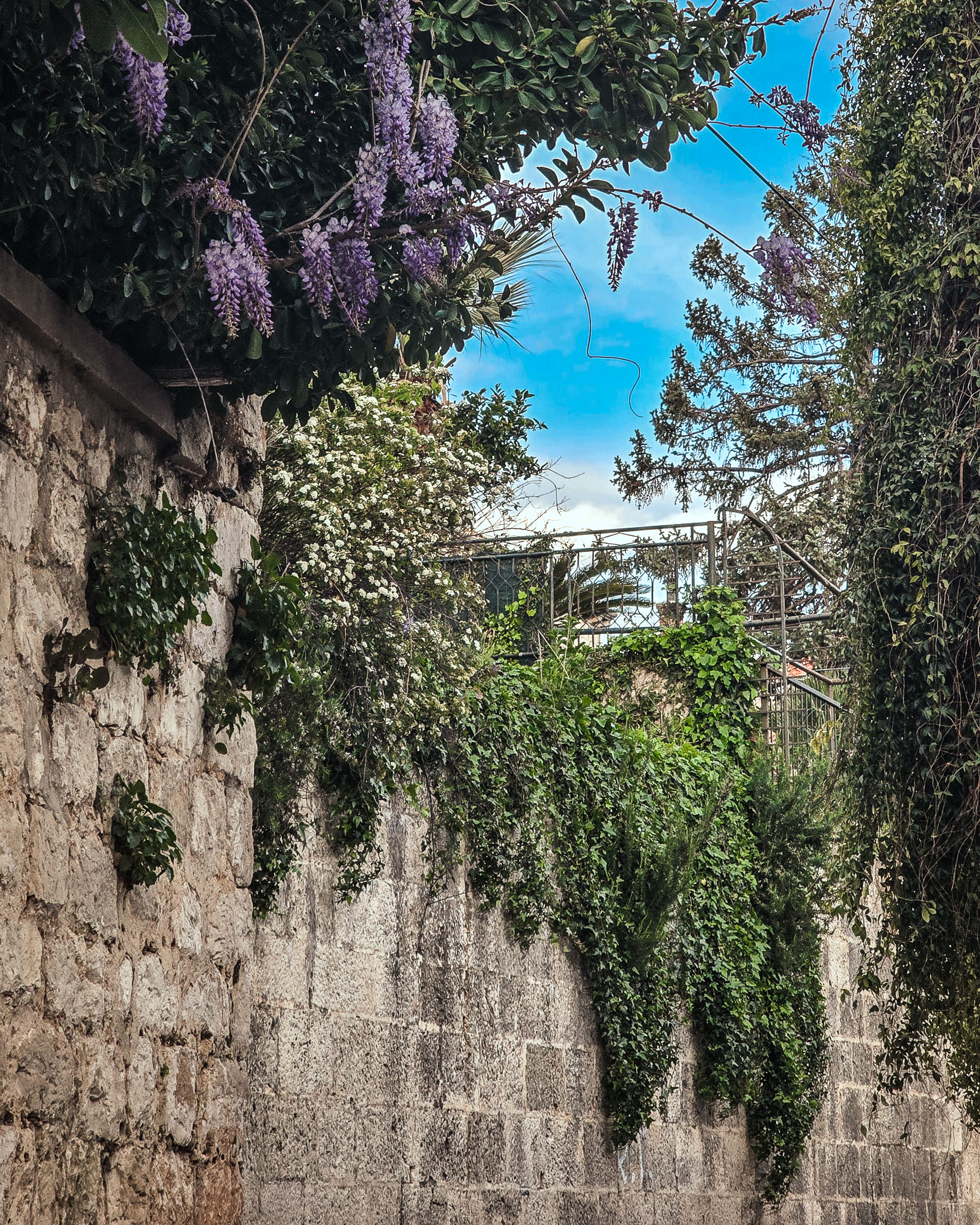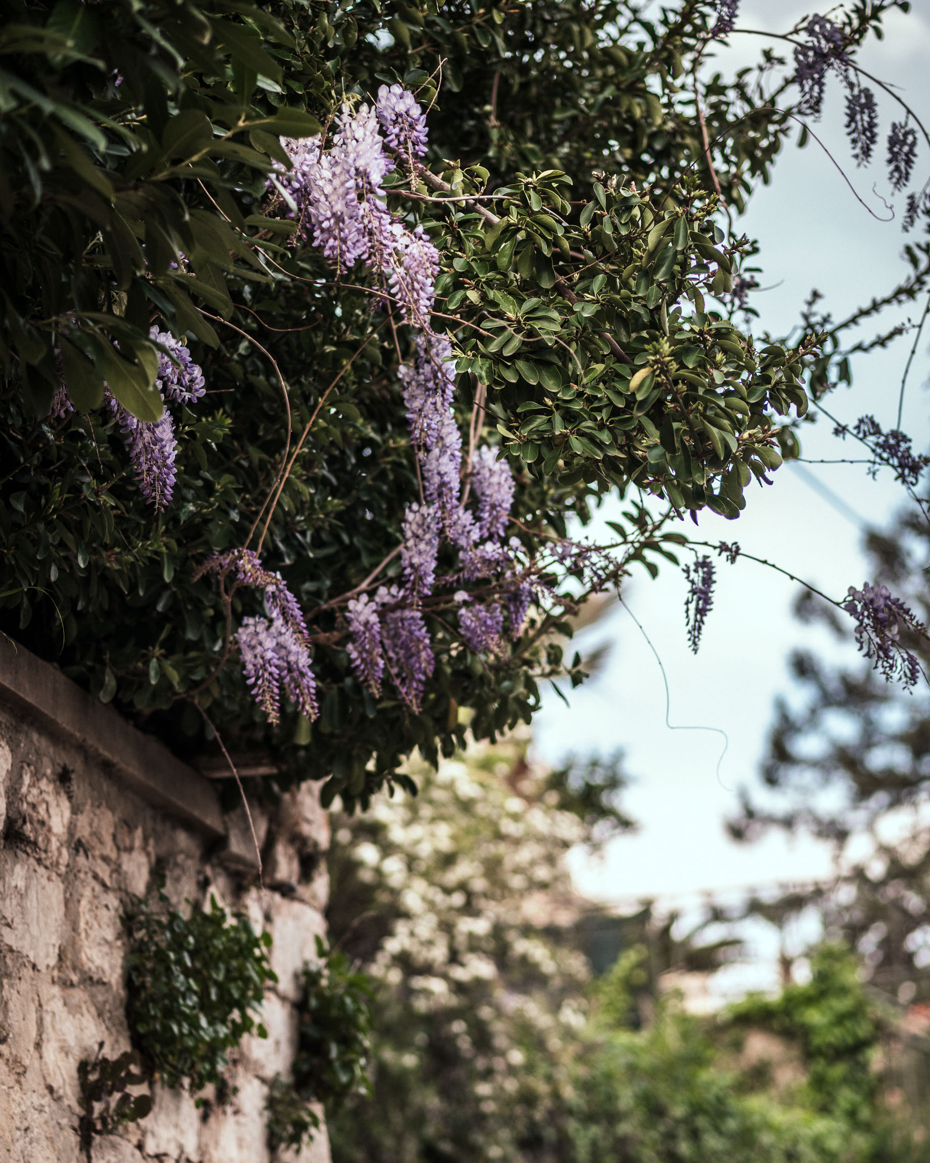 Zwiewne kiście fioletowej wisterii zwisające z gęstej zieleni tworzą romantyczną scenę wśród kamiennej architektury. Kadr ma w sobie miękkość i poetykę, a dzięki lekkiej głębi ostrości tło zlewa się z pastelowym niebem, podkreślając główny motyw. Wisteria wprowadza tu naturalną elegancję, a mur przypomina o śródziemnomorskiej historii tego miejsca.