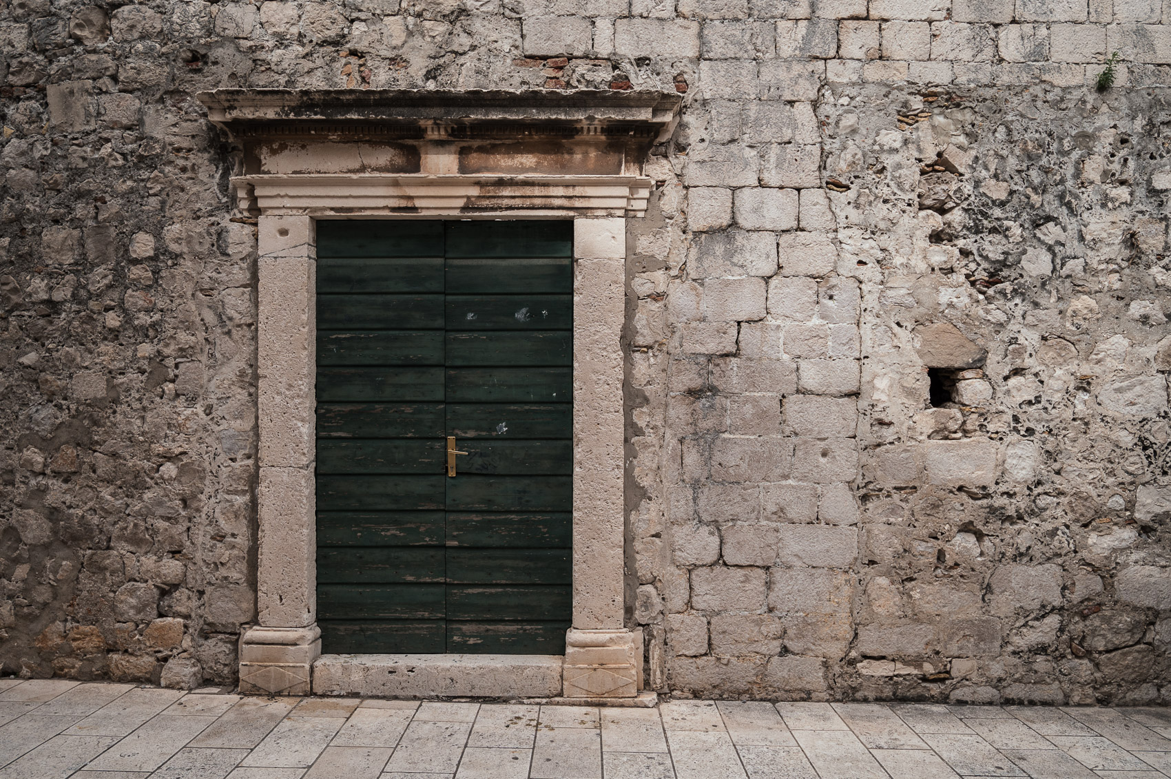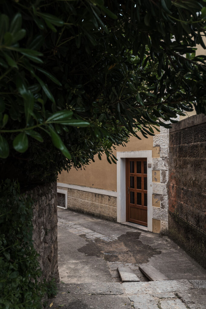 Dubrownik to miasto detali – a zielone, drewniane drzwi z patyną, oprawione w kamień, wyglądają jak z katalogu wnętrz. Ściana zdradza wiek i historię budynku, a jednocześnie prezentuje się jak płótno – faktury i kolory współgrają bez przesady.