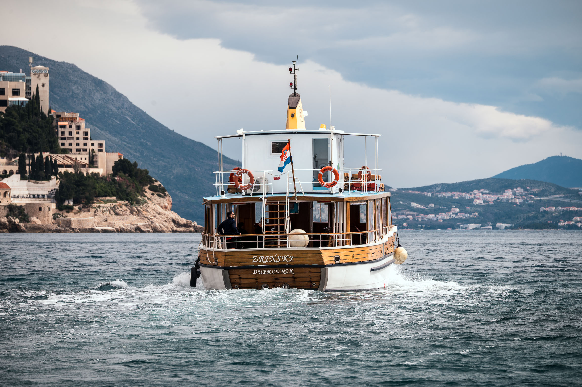 To ujęcie „z tyłu” statku świetnie eksponuje jego nazwę, linię kadłuba i charakterystyczny chorwacki klimat. Zdjęcie w tele (~240 mm) pozwala „ściągnąć” obiekt w kadr i sprasować tło. Fajnie działa tu także perspektywa liniowa fal pozostawionych przez śrubę – prowadzi wzrok dokładnie tam, gdzie trzeba.