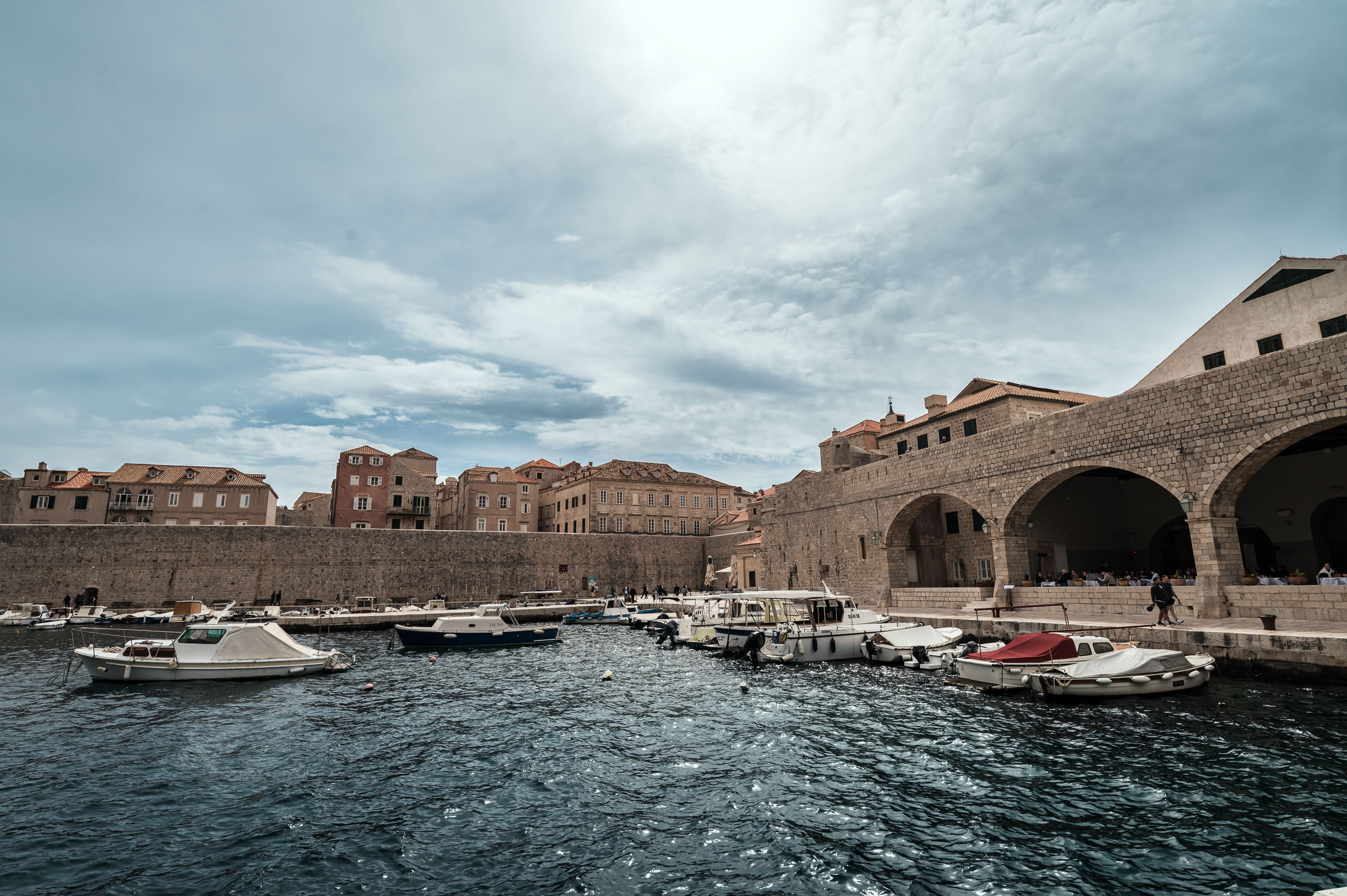 To część portu, gdzie znajduje się budynek z charakterystycznymi arkadami – to słynna restauracja Arsenal. Kiedyś mieścił się tu magazyn broni i amunicji Republiki Dubrownickiej. Miejsce klimatyczne, z widokiem na zacumowane łodzie i mur obronny po drugiej stronie.