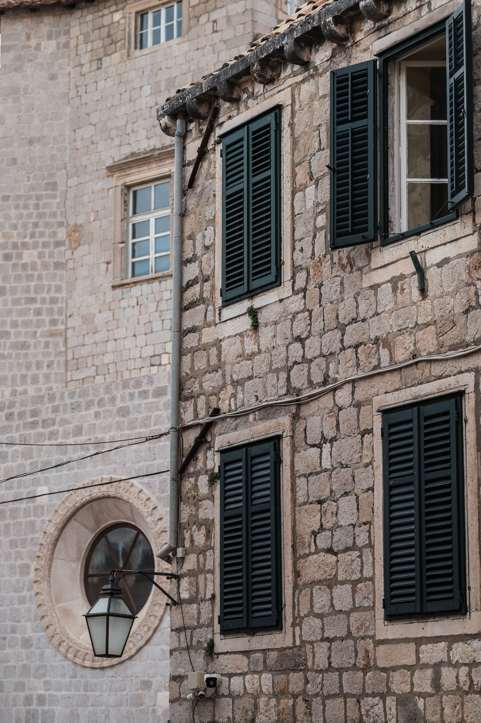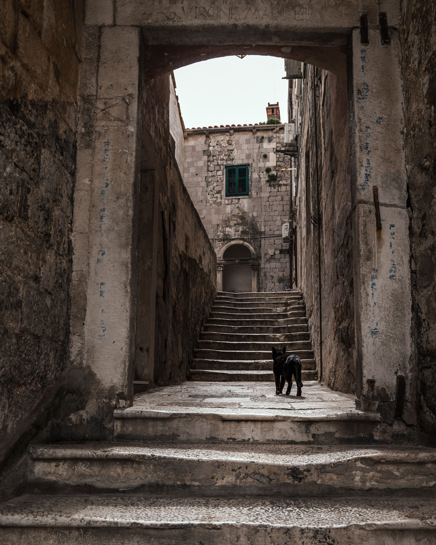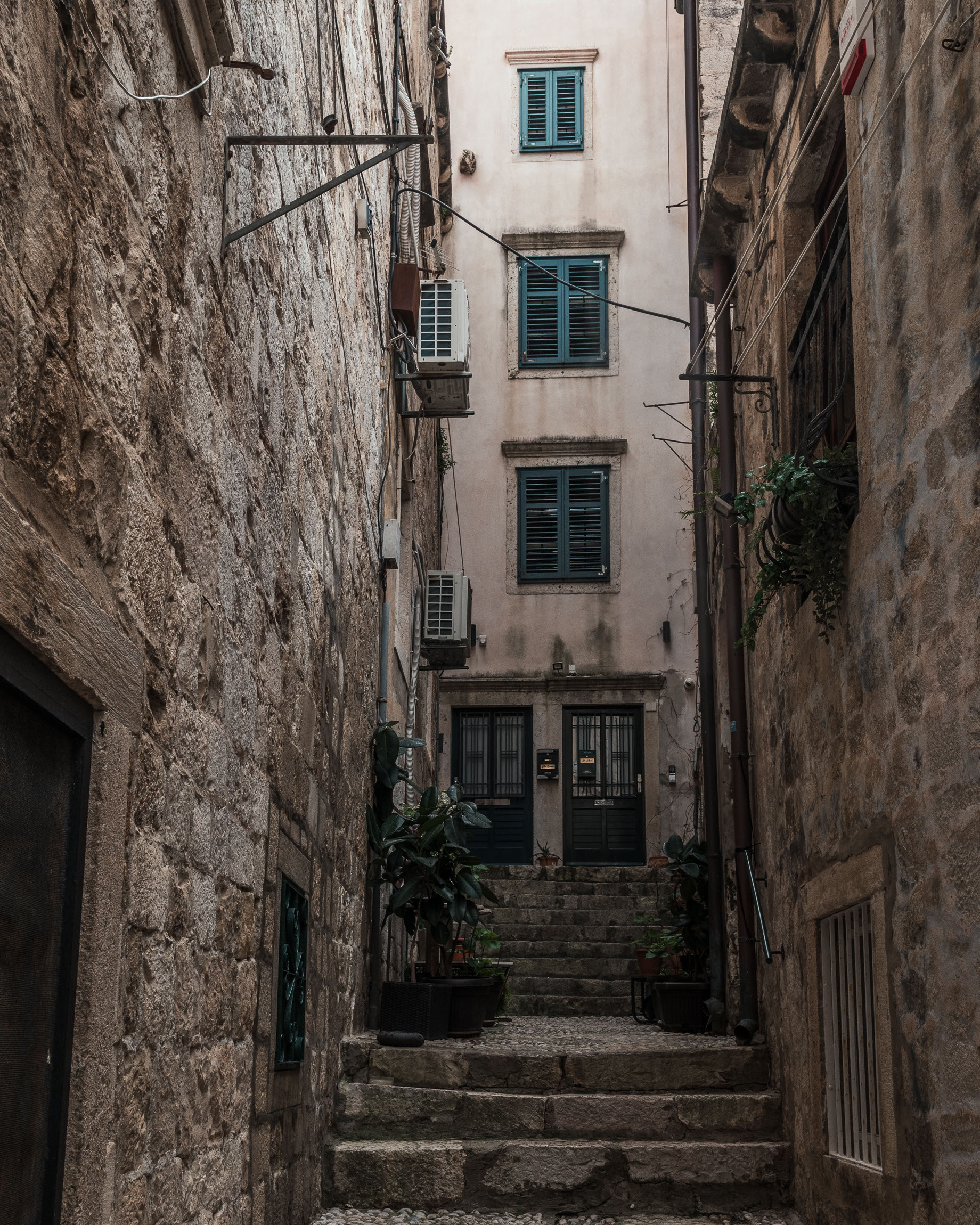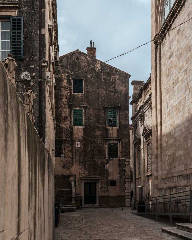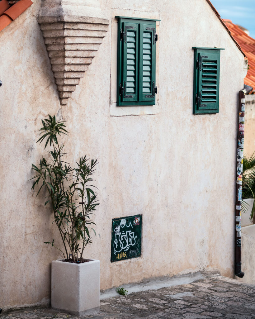 To ujęcie pokazuje piękno codzienności – wąska uliczka i typowa dubrownicka kamienica z zielonymi okiennicami. Uwagę przykuwa symetria, powtarzalność form i lekkie światło wpadające z góry, które dodaje miękkości.