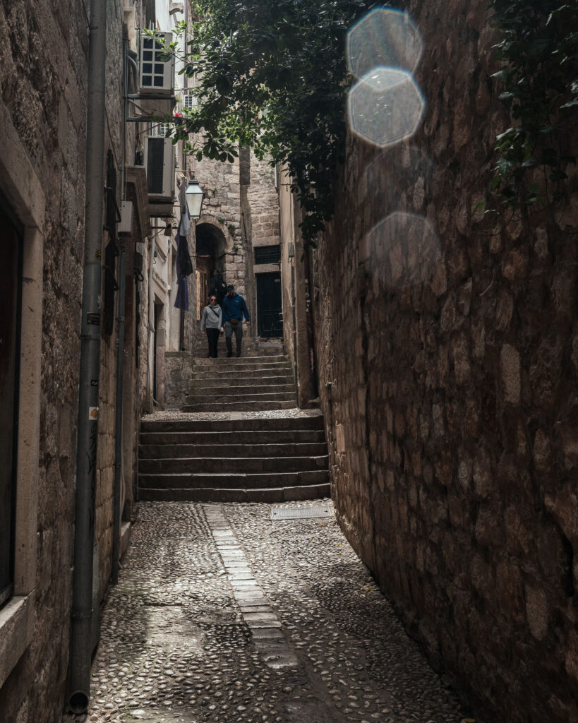 To ujęcie z jednej z licznych dubrownickich uliczek wspinających się ku górze. Co przykuwa uwagę? Gra światła, które załamując się na soczewce, tworzy flary. Z lewej – klasyczne, kamienne elewacje, z prawej – zieleń pnąca się po murze, a wszystko to zamknięte w miękkiej perspektywie prowadzącej w głąb.