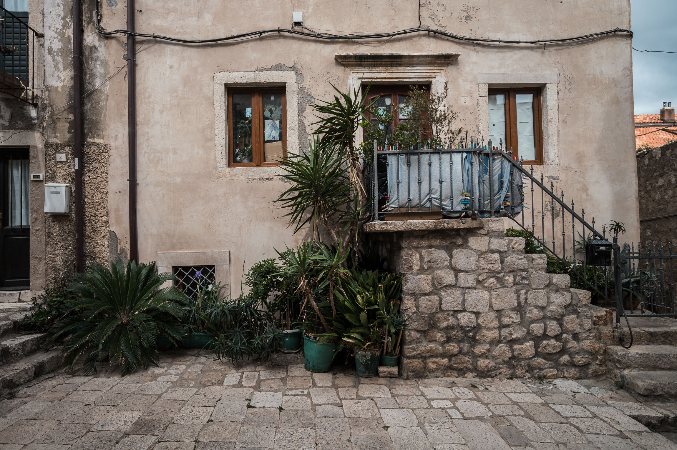 Ten kadr ma coś z pocztówki, ale takiej… prywatnej. To fragment miejskiego życia – ściany z historią, roślinność w donicach, lekko krzywa balustrada i trochę chaosu. I to właśnie ten chaos sprawia, że zdjęcie jest tak autentyczne.