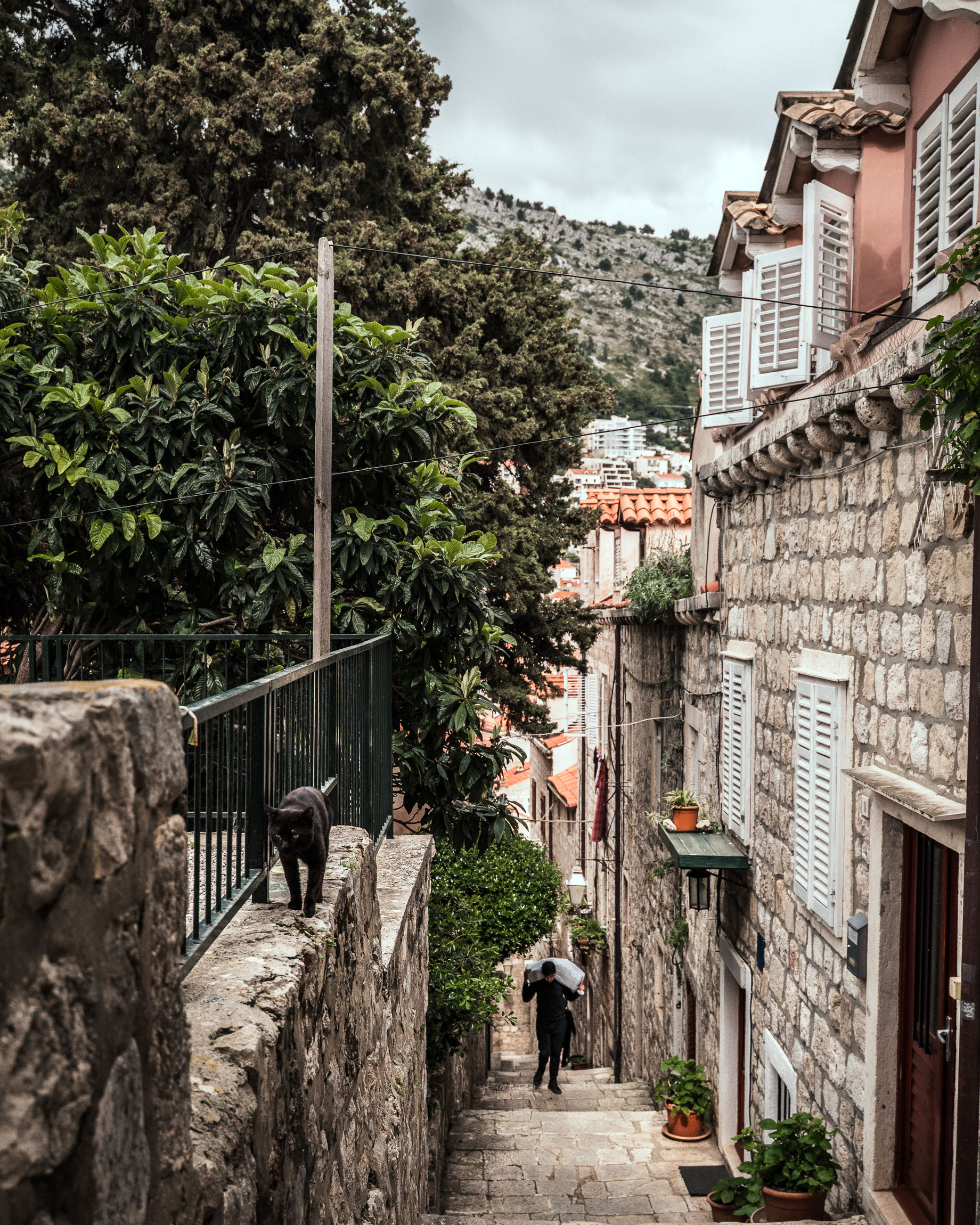Ten kadr to prawdziwy uliczny teatr – z lewej strony po murze przechadza się czarny kot, a w tle schodami wchodzi mężczyzna z pakunkiem na plecach. Wszystko otulone zielenią i ciepłem lokalnej architektury. Niby codzienność, a jednak pełna uroku i ruchu.