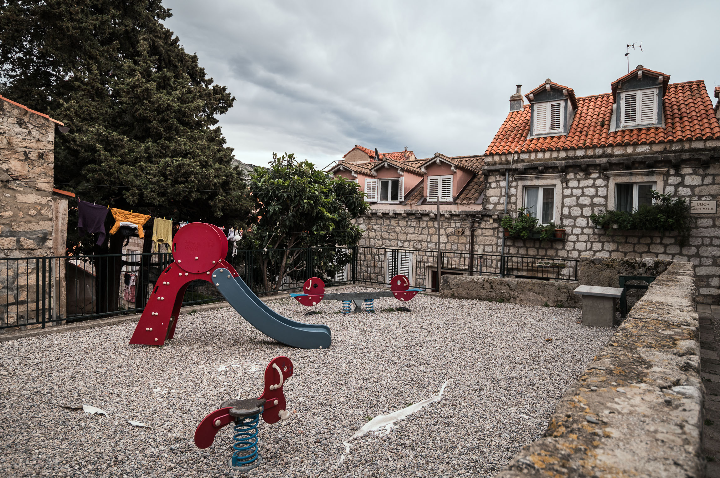 Kolorowy plac zabaw otoczony kamienicami z czerwonymi dachami – zderzenie dziecięcej energii z surowością historycznego muru. Pranie na sznurku dodaje ludzkiego pierwiastka.