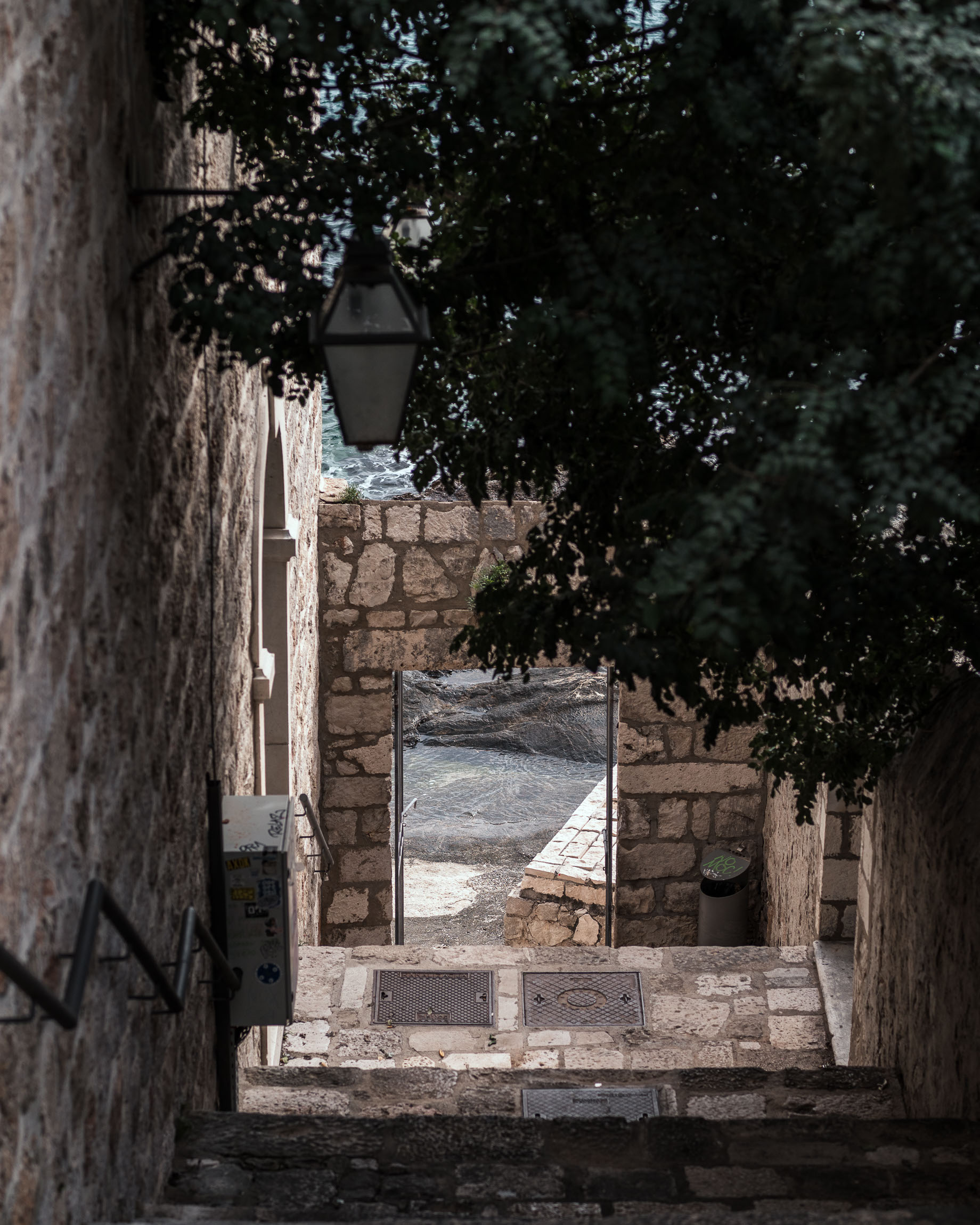 Cisza, chłodny kamień pod stopami i szmer fal przelewających się o skały. Ten kadr to uchwycony moment przejścia – nie tylko fizycznego, ale i emocjonalnego – z miejskiego zgiełku do wyciszenia, które przynosi widok na morze. Ciemna korona drzewa kadruje scenę niczym zasłona w teatrze, a naturalne światło prowadzi wzrok ku prostokątnej bramie z widokiem na kamienne wybrzeże.
