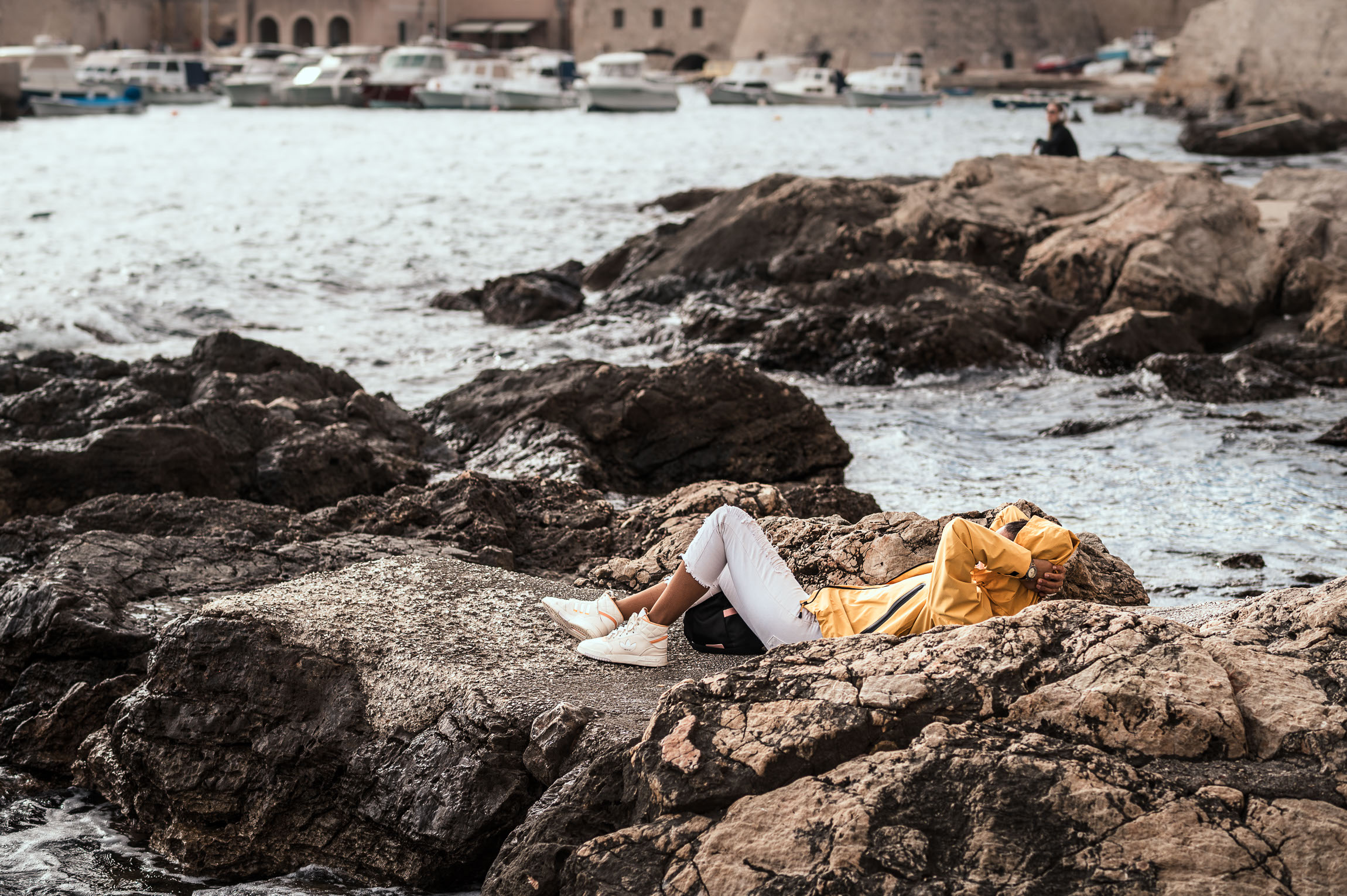 To zdjęcie opowiada historię chwili zatrzymanej w czasie – relaks pośród twardych skał i szumu morza. Żółta kurtka staje się punktem skupienia, kontrastując z chłodnymi tonami otoczenia. Mimo pozornego bezruchu, kadr pulsuje życiem – morze za plecami, łodzie w tle, i kobieta zanurzona w ciszy.