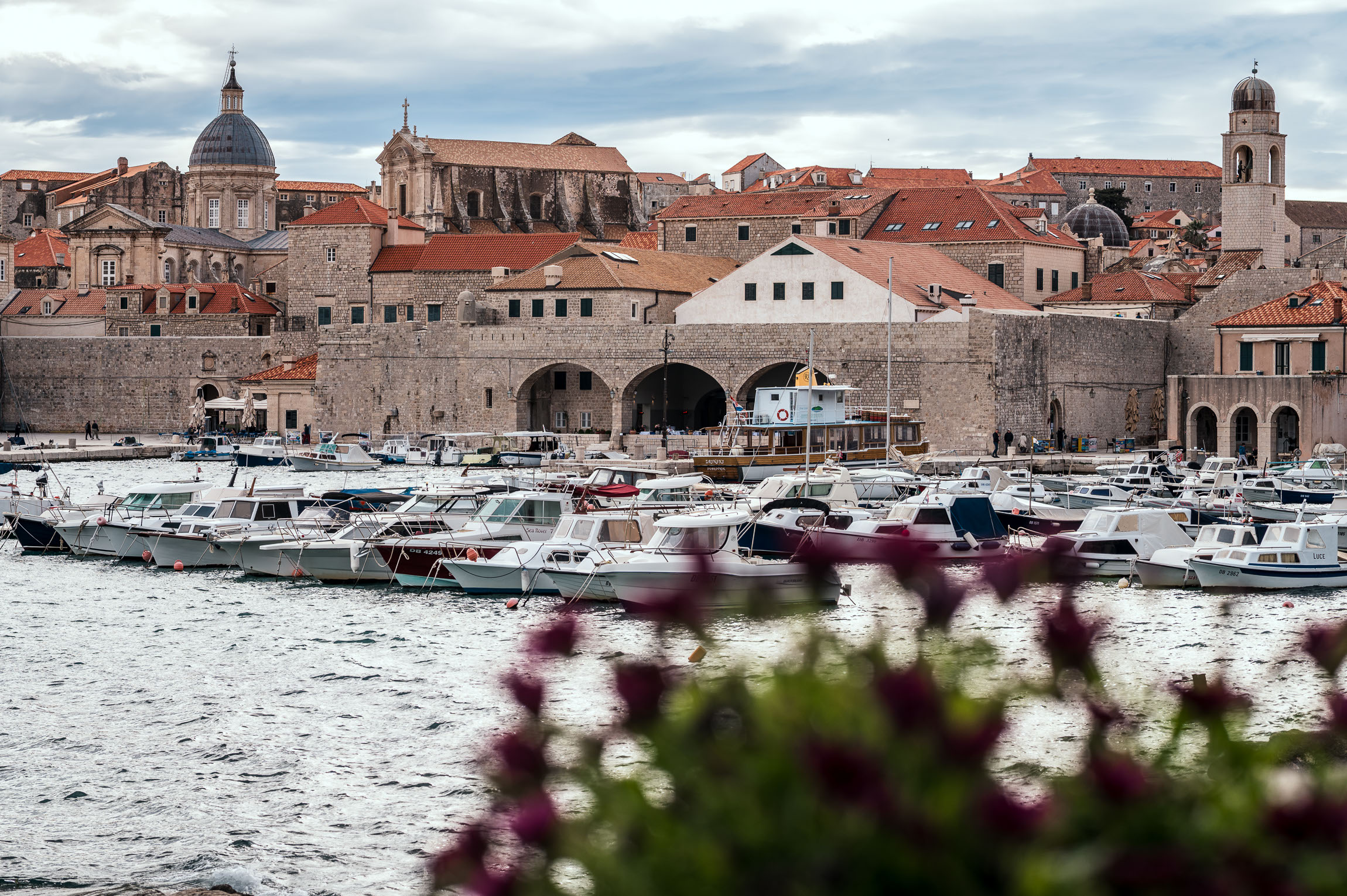 Port w Dubrowniku w całej okazałości – rzędy białych łodzi kołyszących się na wzburzonej wodzie, a za nimi monumentalna zabudowa starego miasta. Na tle beżowych i czerwonych dachów wyraźnie wznoszą się kopuły i wieże kościołów. Przemyślana kompozycja uwzględnia rozmyte kwiaty na pierwszym planie, które wprowadzają romantyczny akcent i nadają głębię całej scenie.