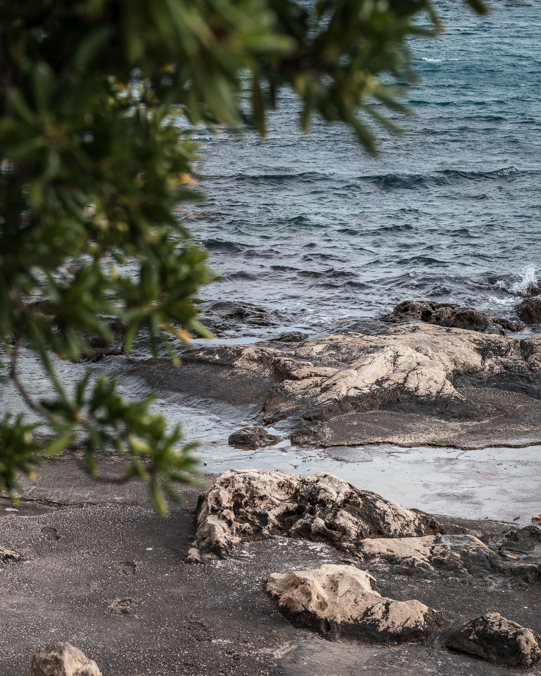 Spokojna, surowa plaża z czarnym piaskiem i jasnymi skałami, nad którymi rozciąga się lazurowe, lekko wzburzone morze. Zielone gałęzie w górnej części kadru tworzą naturalną ramę i dodają głębi.