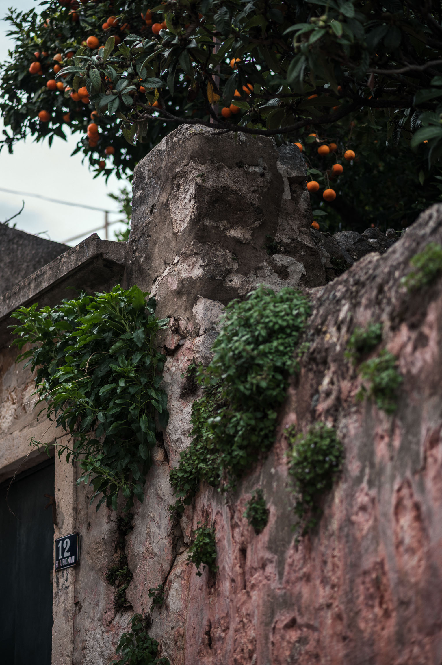 Sielska scena: stary, różowo spłowiały mur porośnięty bujną roślinnością, nad którym wznosi się drzewo pełne dojrzewających owoców. Numerek 12 dodaje dokumentalnego smaczku.