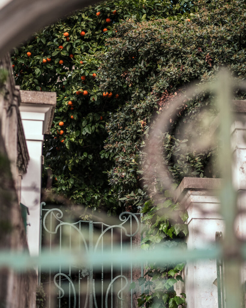 Drzewo pomarańczy ukryte w gęstej zieleni i schowane za secesyjną bramą. Subtelna rama z żelaznego ogrodzenia tworzy naturalny przedni plan, co dodaje zdjęciu wrażenia „podglądania” prywatnego ogrodu. Mimo że główny temat – owoce i gęstwina – znajduje się w tle, to właśnie dzięki temu zdjęcie zyskuje głębię i tajemniczość.