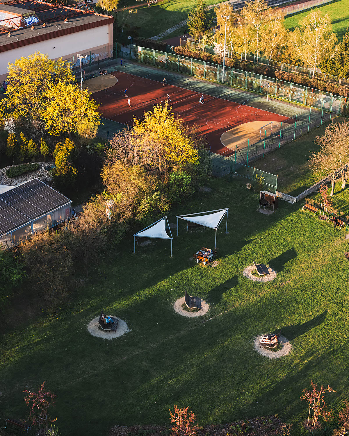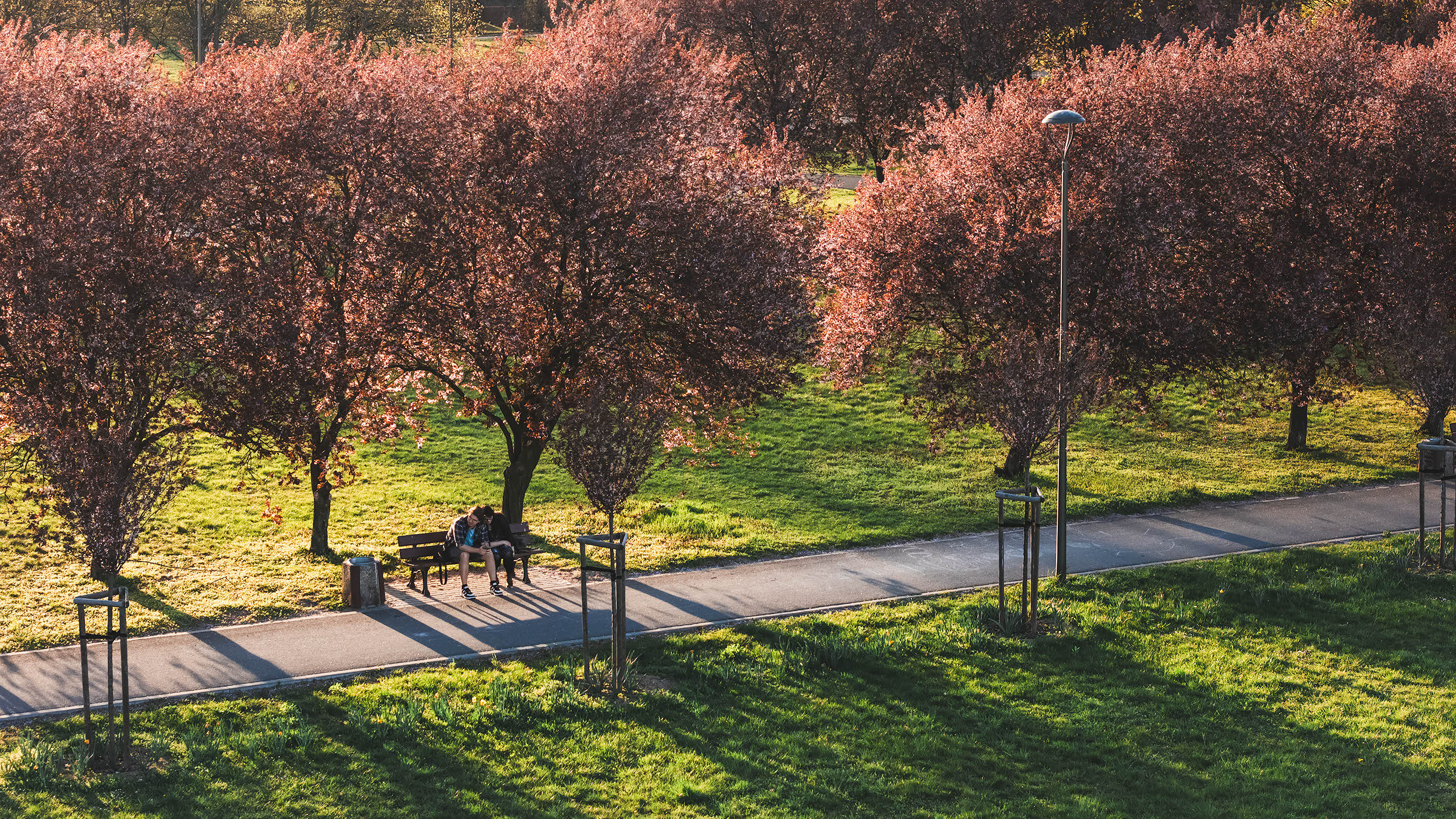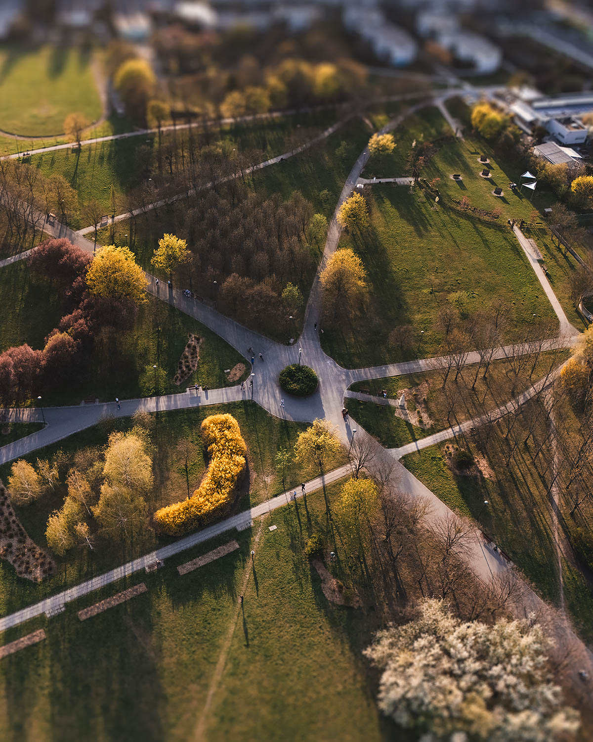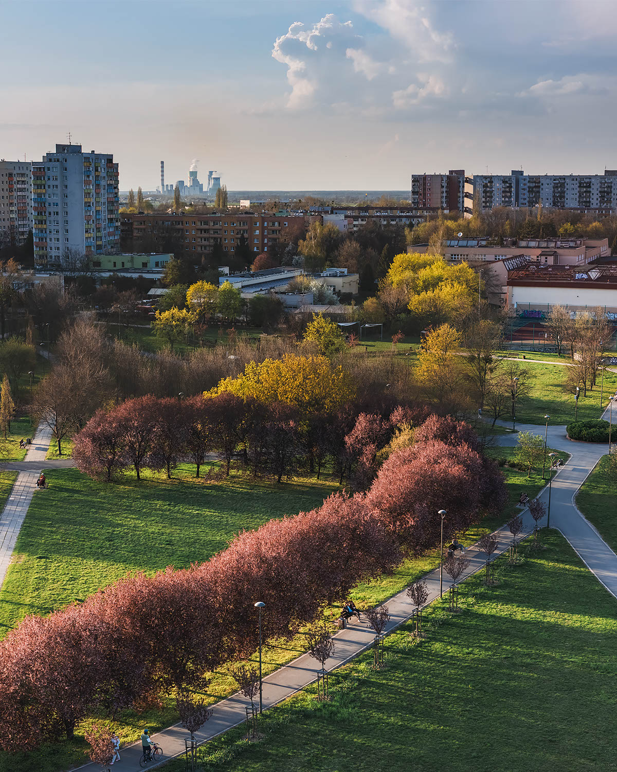 Ponownie odwiedziłem Park im. Armii Krajowej – serce wiosny w Opolu, miejsce, do którego wracam co roku, by uchwycić zmieniający się charakter tego wyjątkowego terenu. Uchwycone z góry ścieżki i drzewa stworzyły niemal bajkowy obraz przypominający makietę, pełen intensywnych barw i dynamicznych cieni rzucanych przez zachodzące słońce. Widok zakochanej pary odpoczywającej na ławce pod kwitnącymi drzewami podkreślił romantyczny, kameralny charakter tego miejsca. W tle, między miejską zielenią, można dostrzec przemysłowe elementy krajobrazu, co daje ciekawy kontrast pokazujący współczesne oblicze Opola.